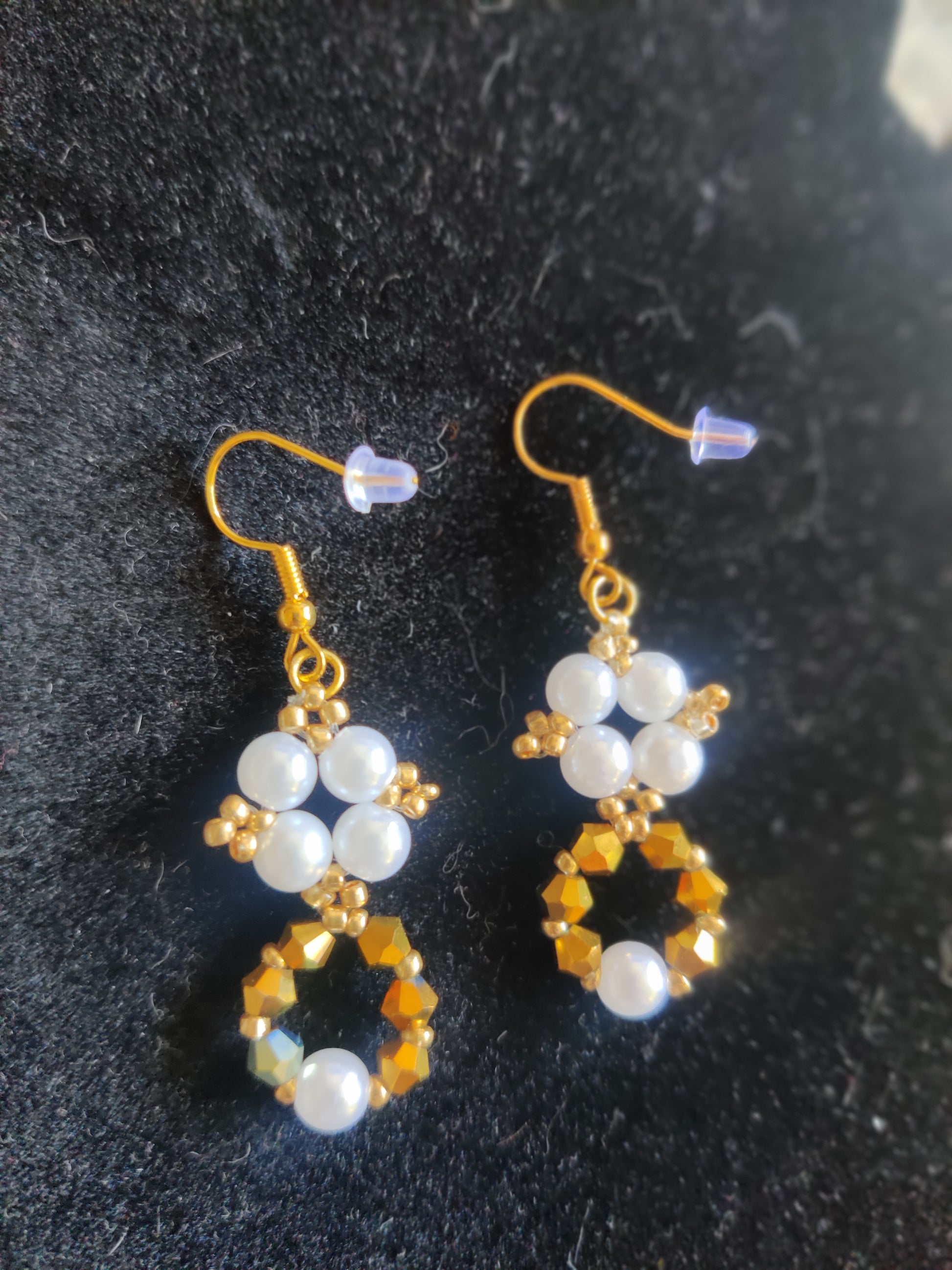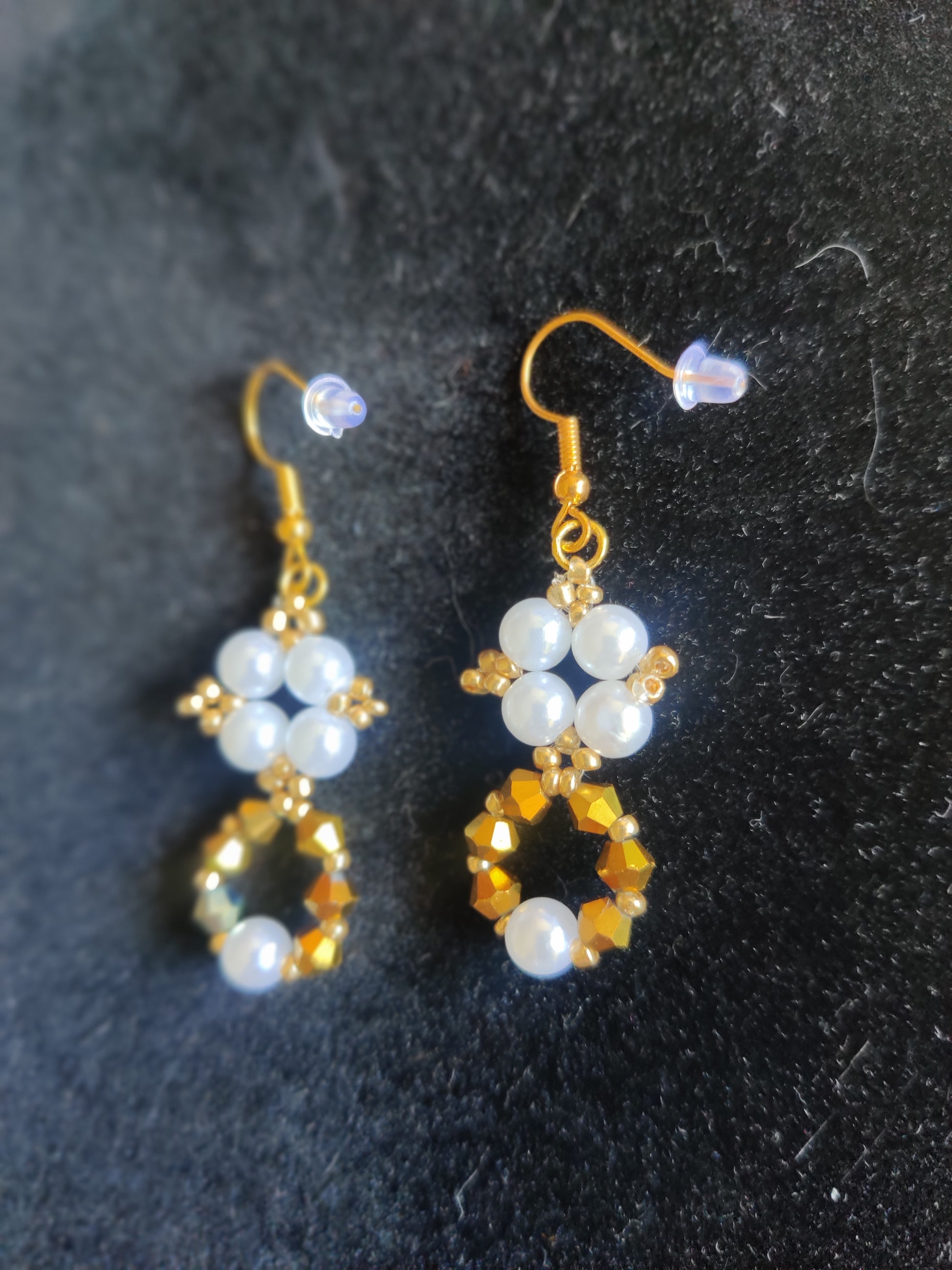 Eleganta och allergivänliga örhängen med vackra vita pärlor och guldiga kristaller. Perfekta för dig som vill ha vackra smycken utan att behöva oroa dig för allergiska reaktioner.