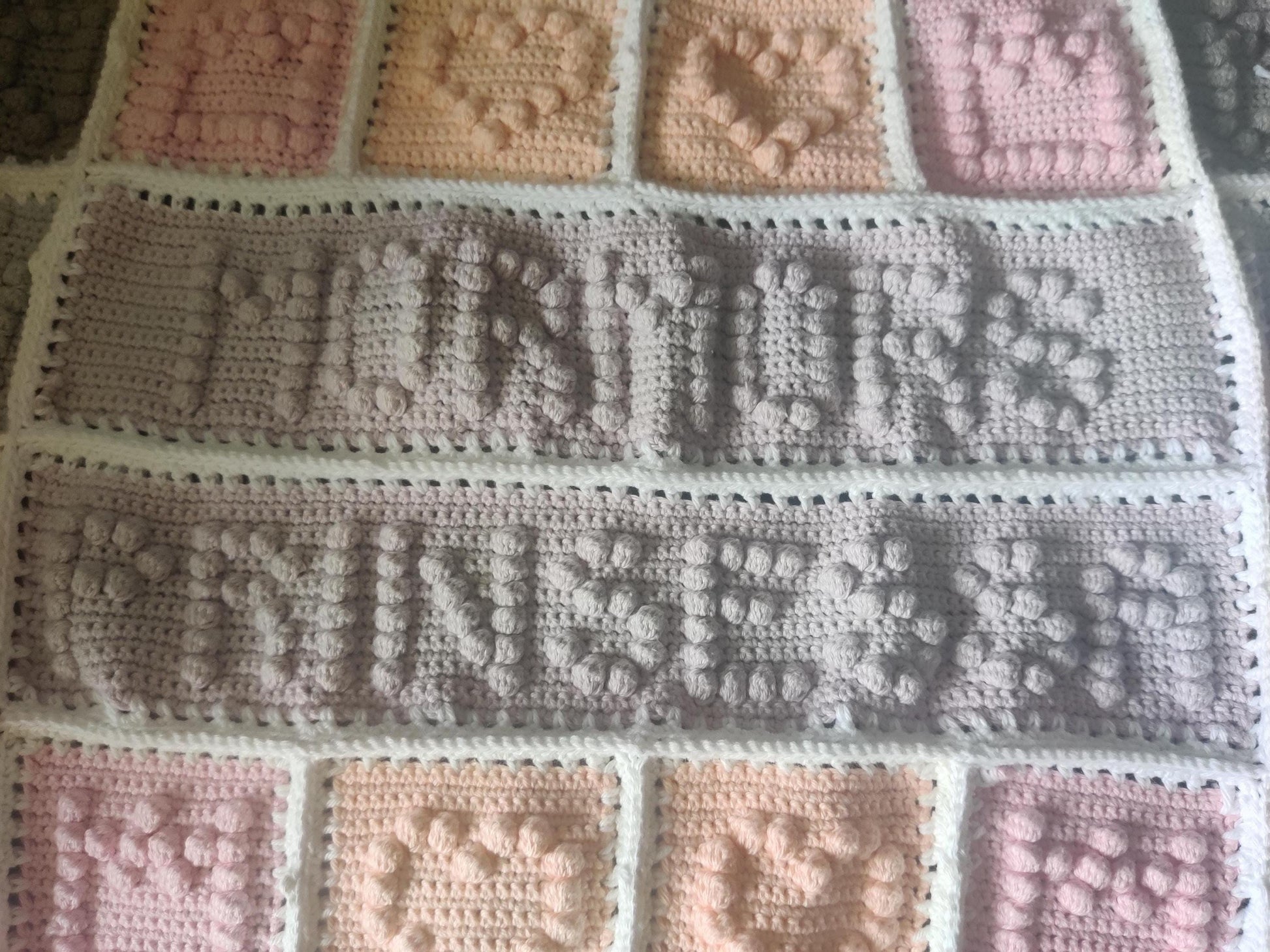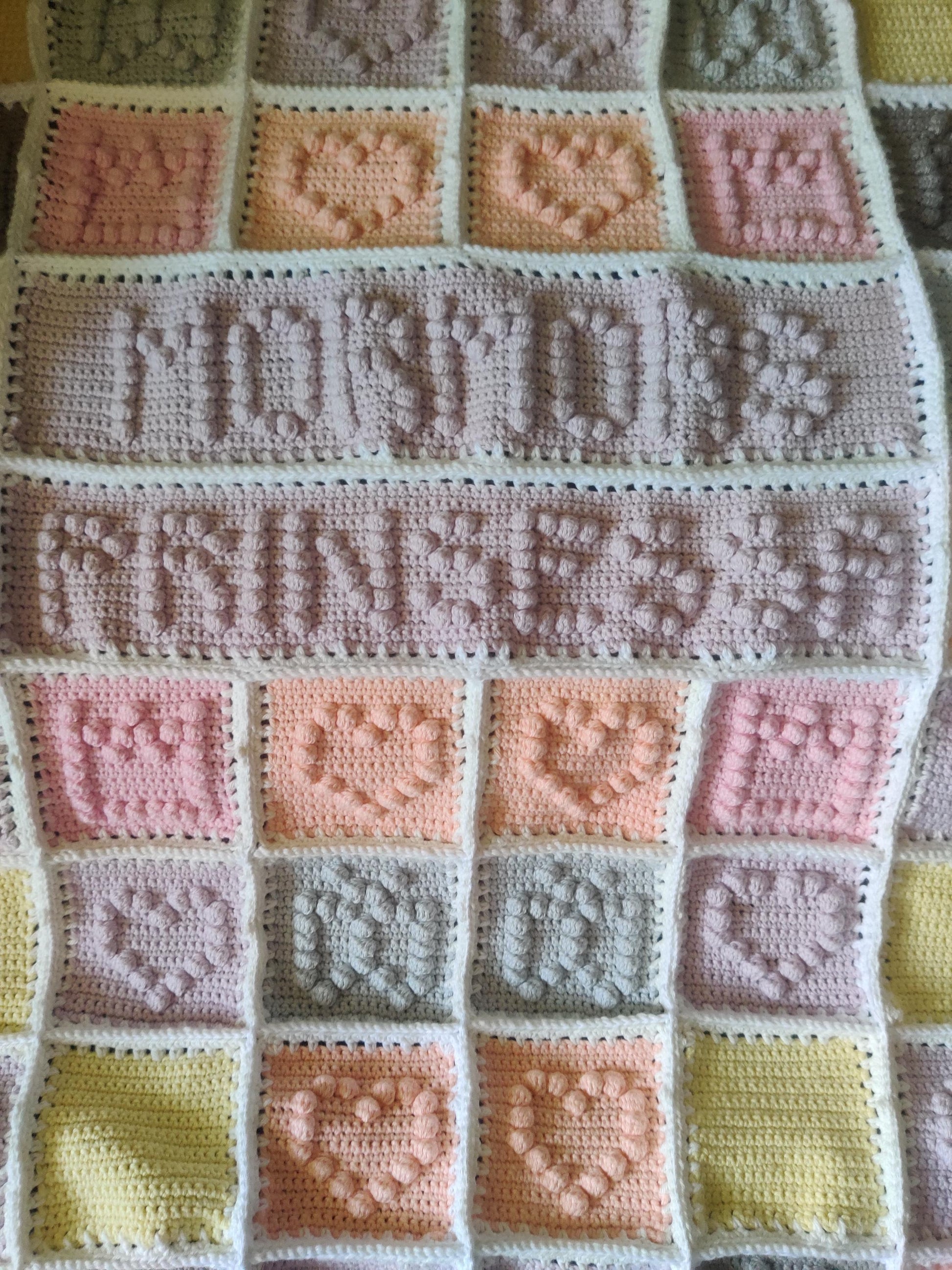 - Texten "MORMORS PRINSESSA" virkad in i filten