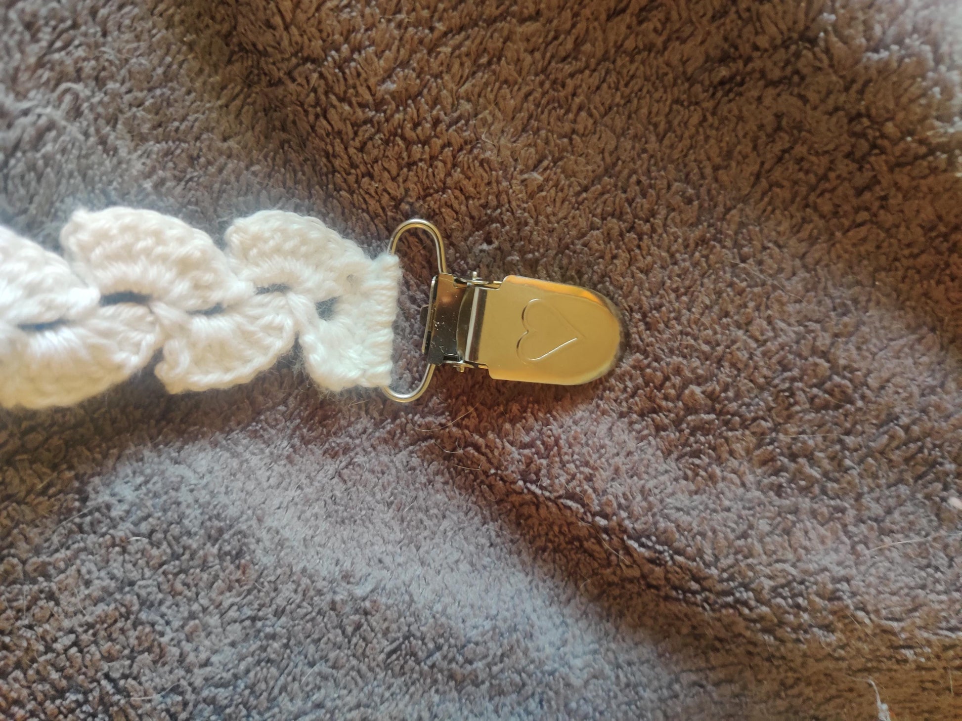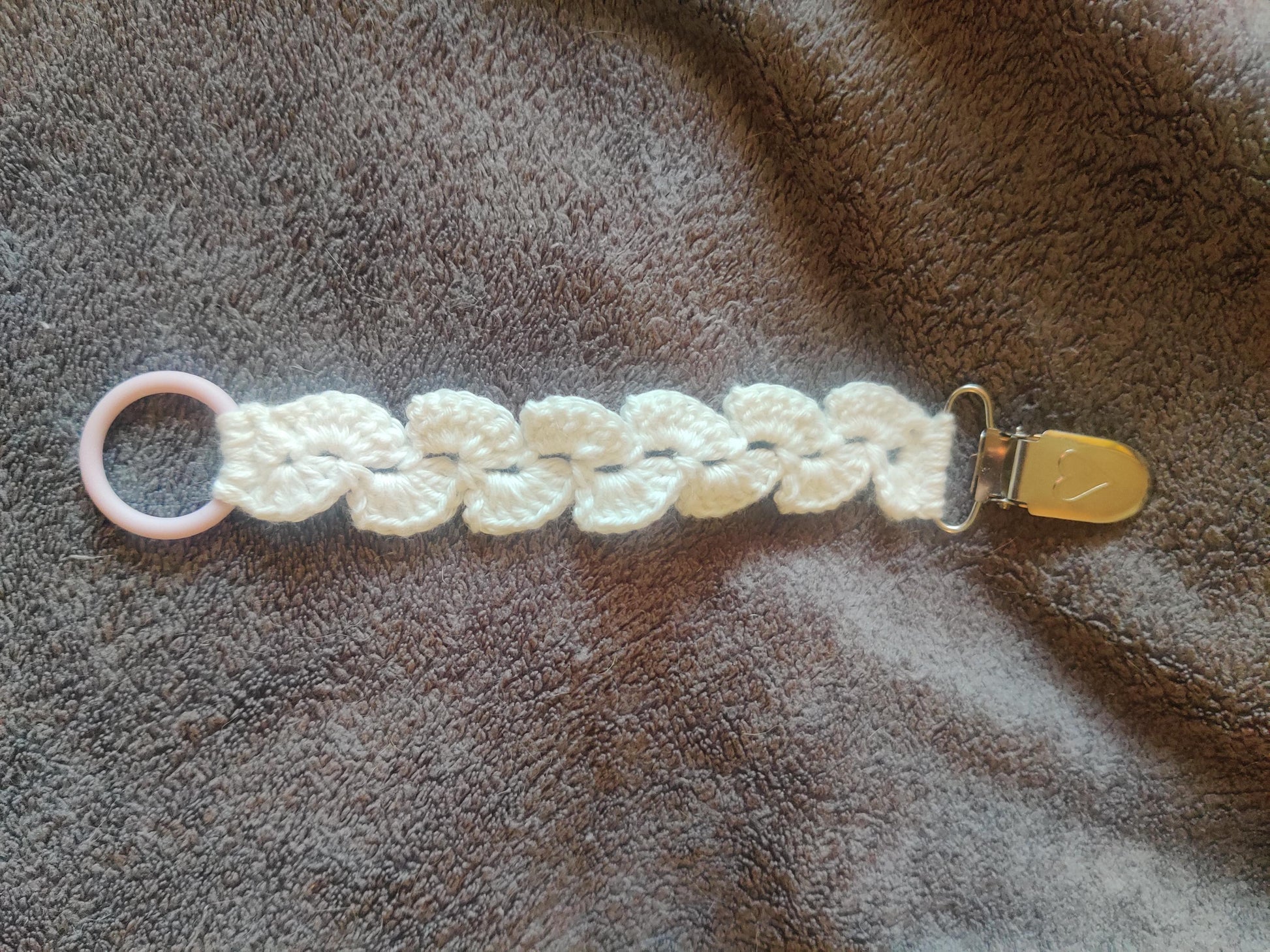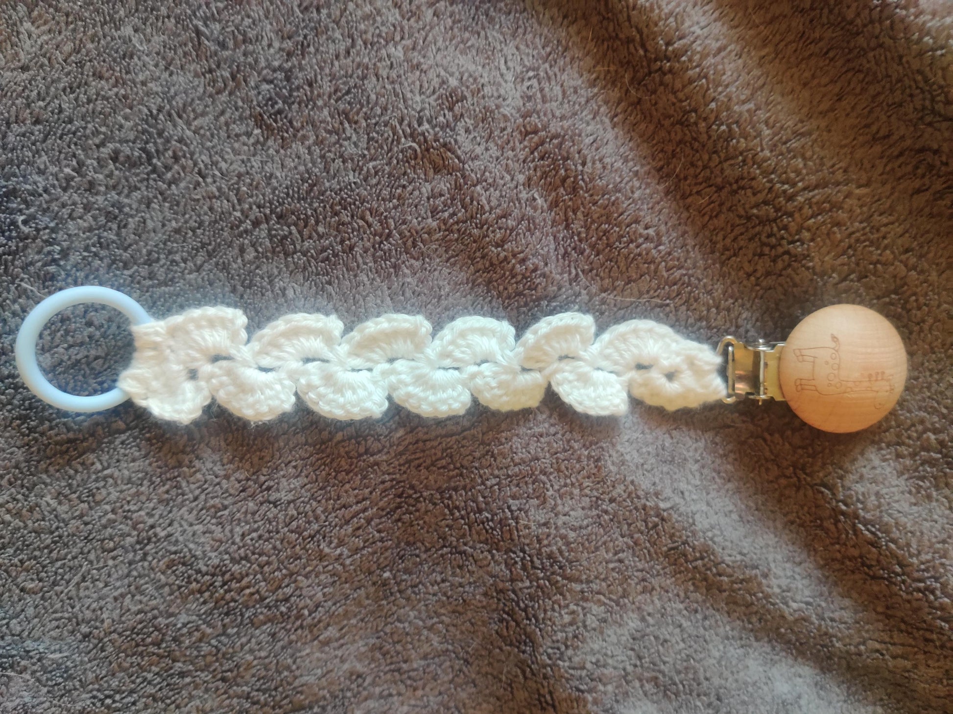 Praktisk handvirkad napphållare som håller barnets napp säkert på plats.