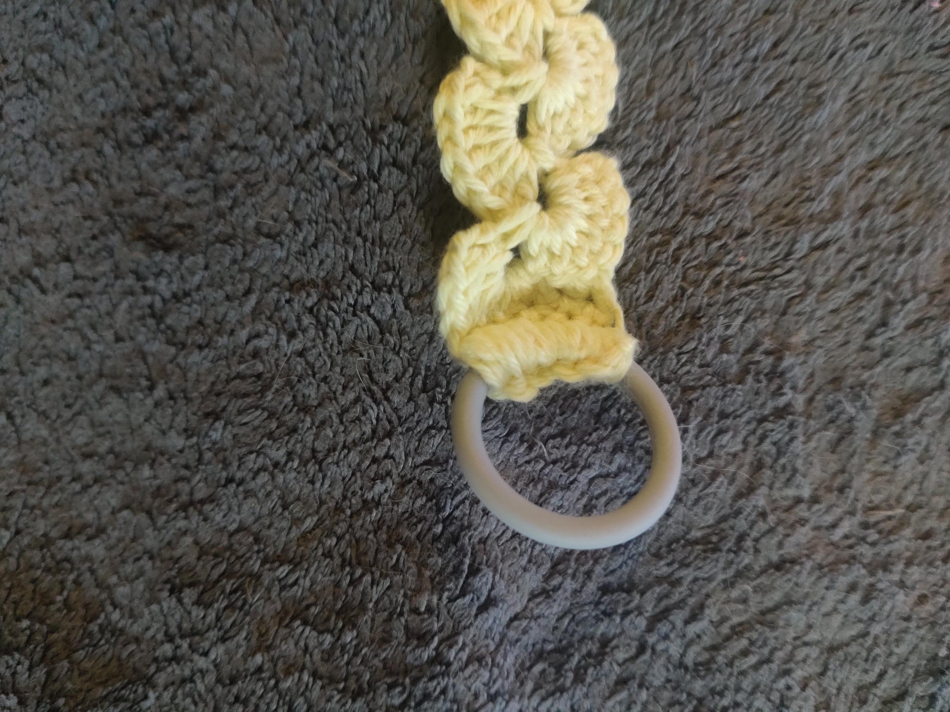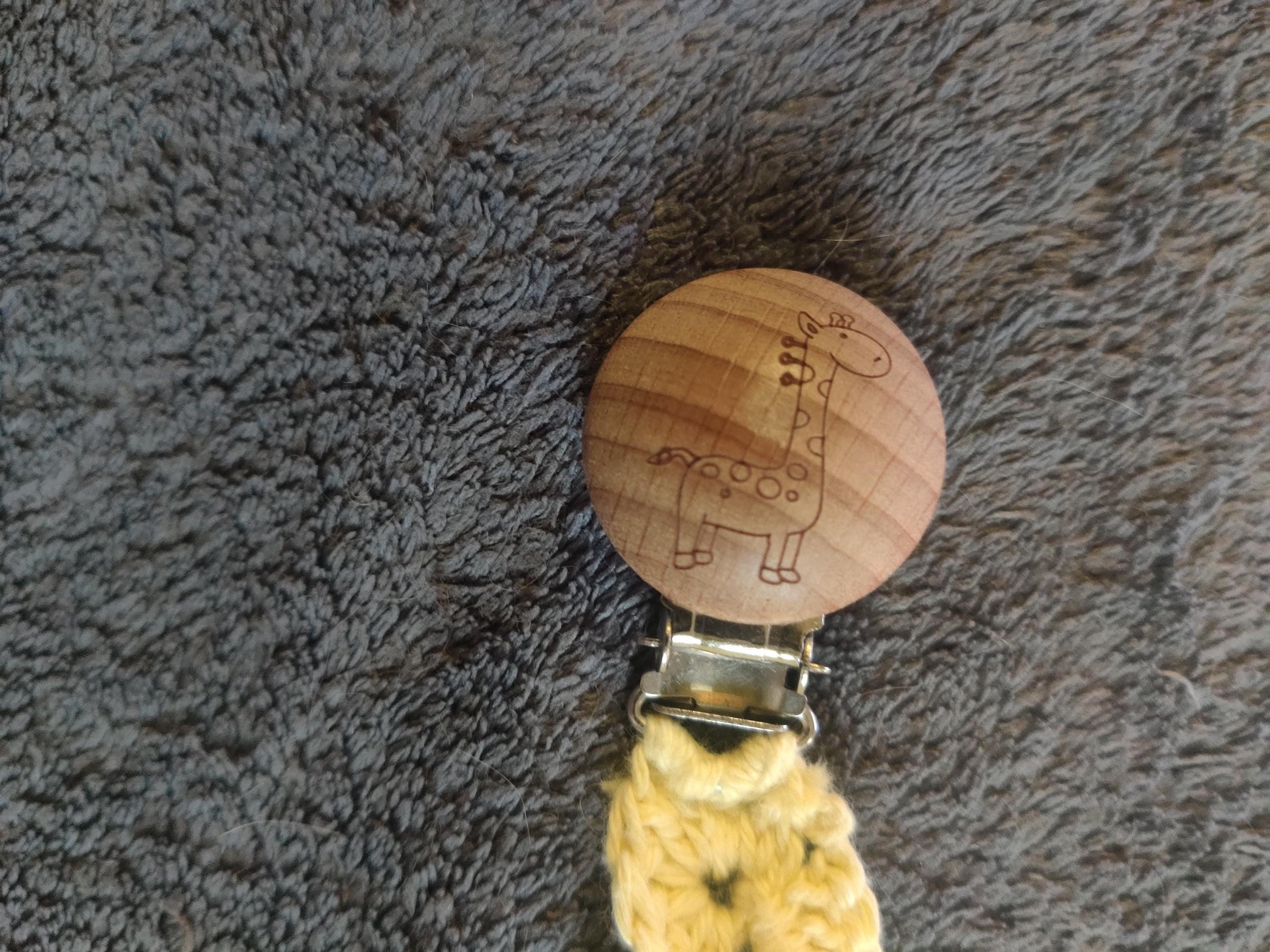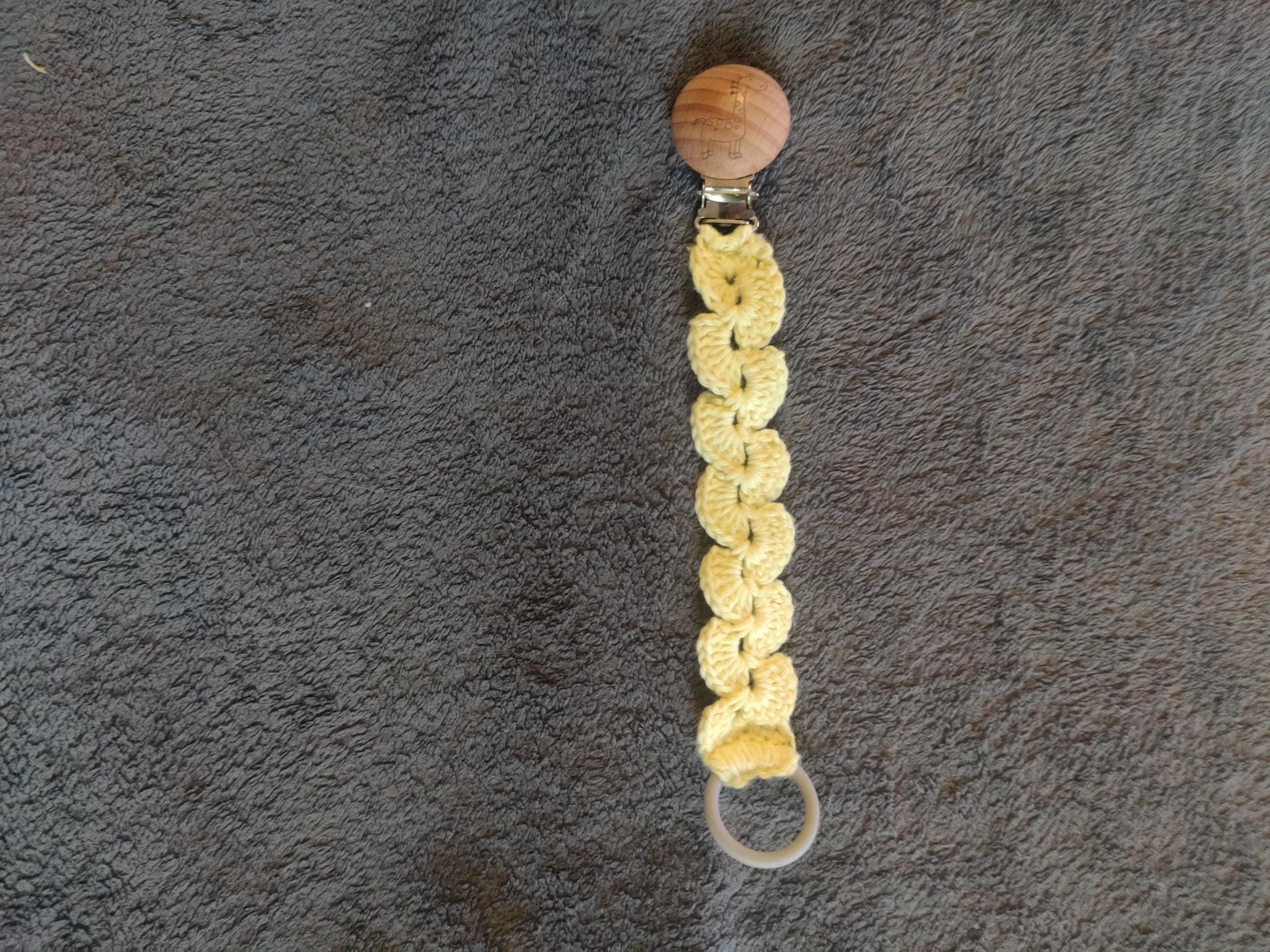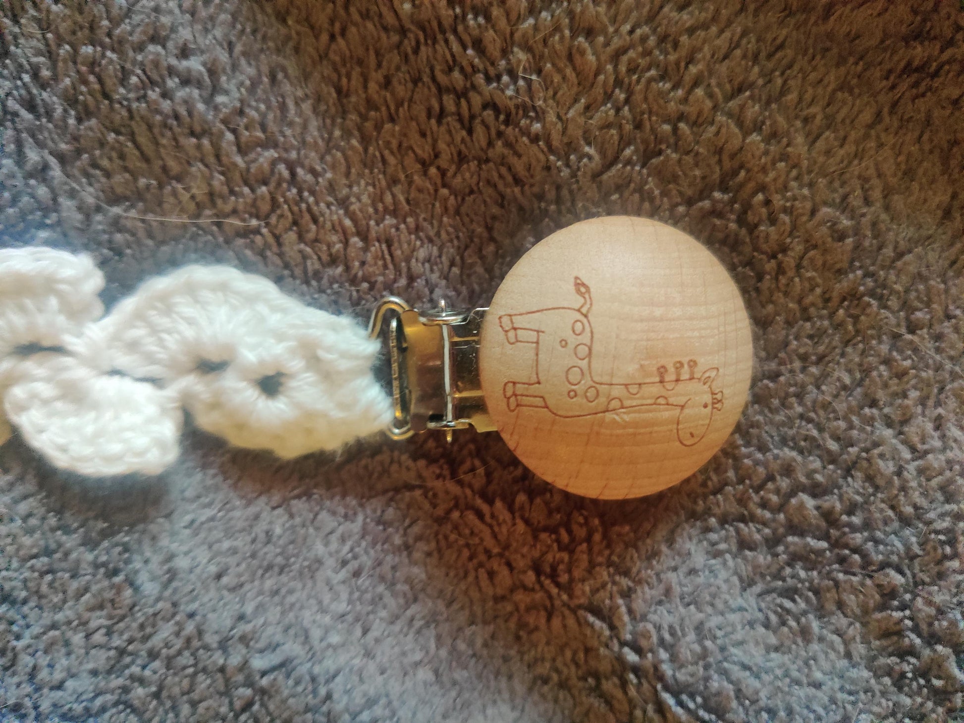 Praktisk handvirkad napphållare som håller barnets napp säkert på plats.