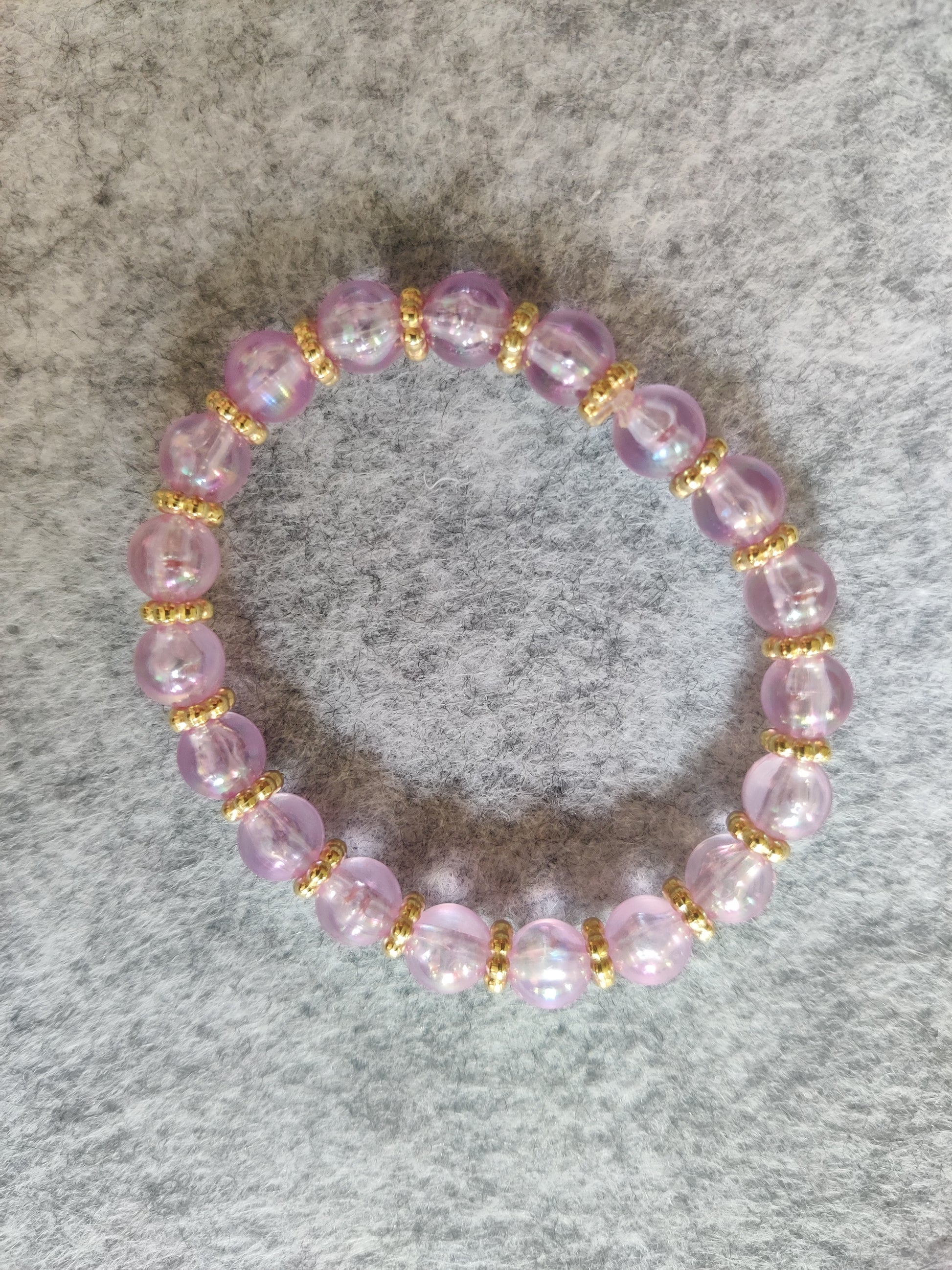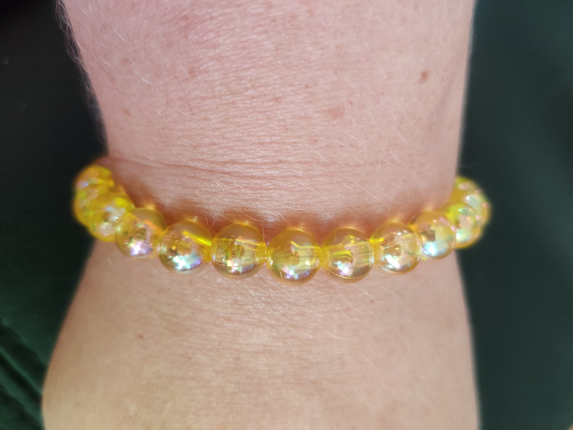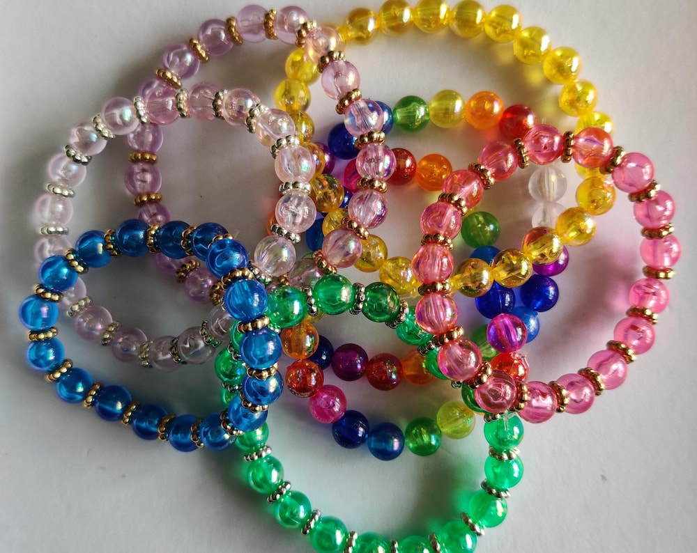Fantastiskt paket med 8 elastiska glasarmband i regnbågens alla färger med eleganta gulddetaljer.
