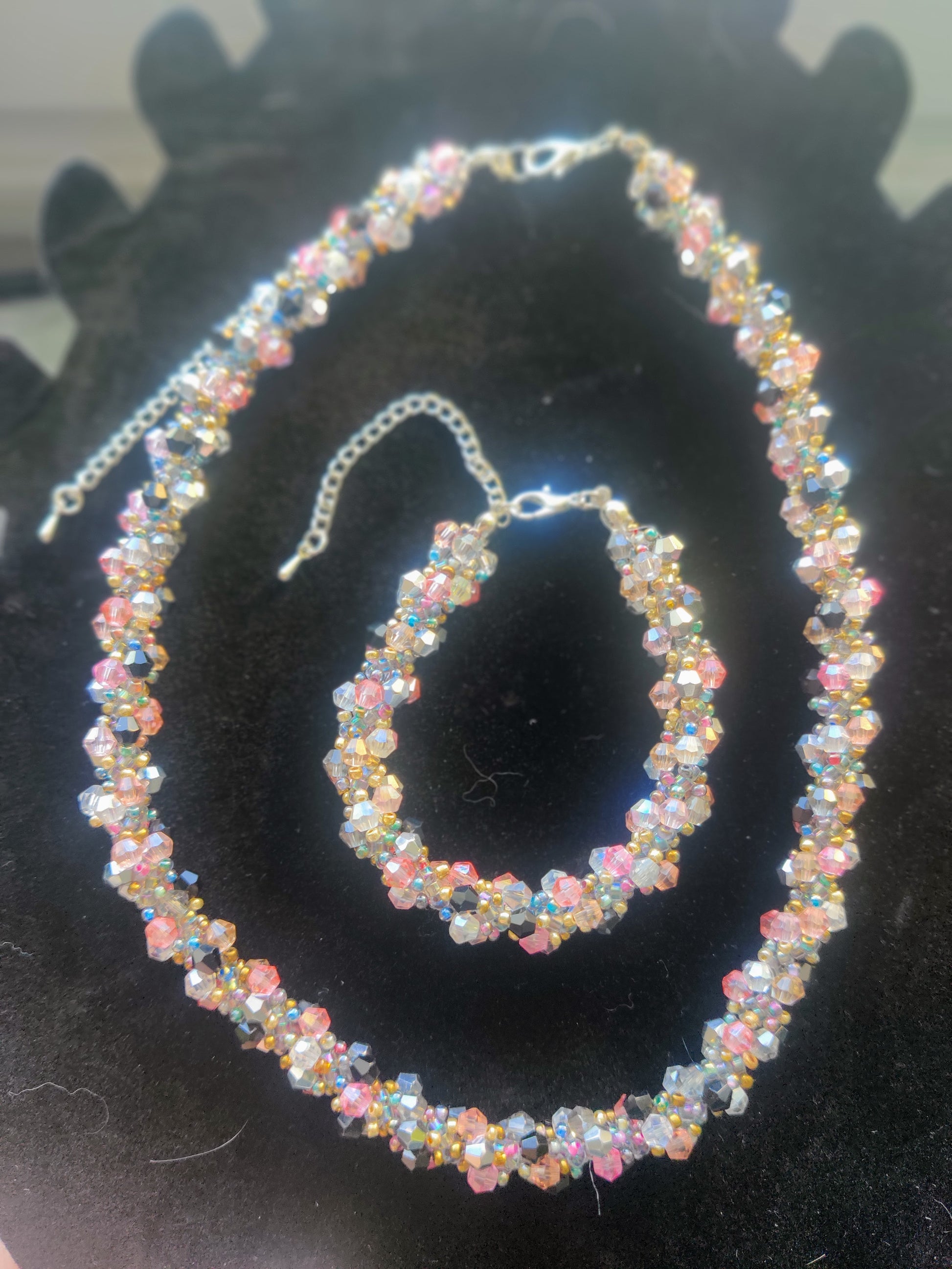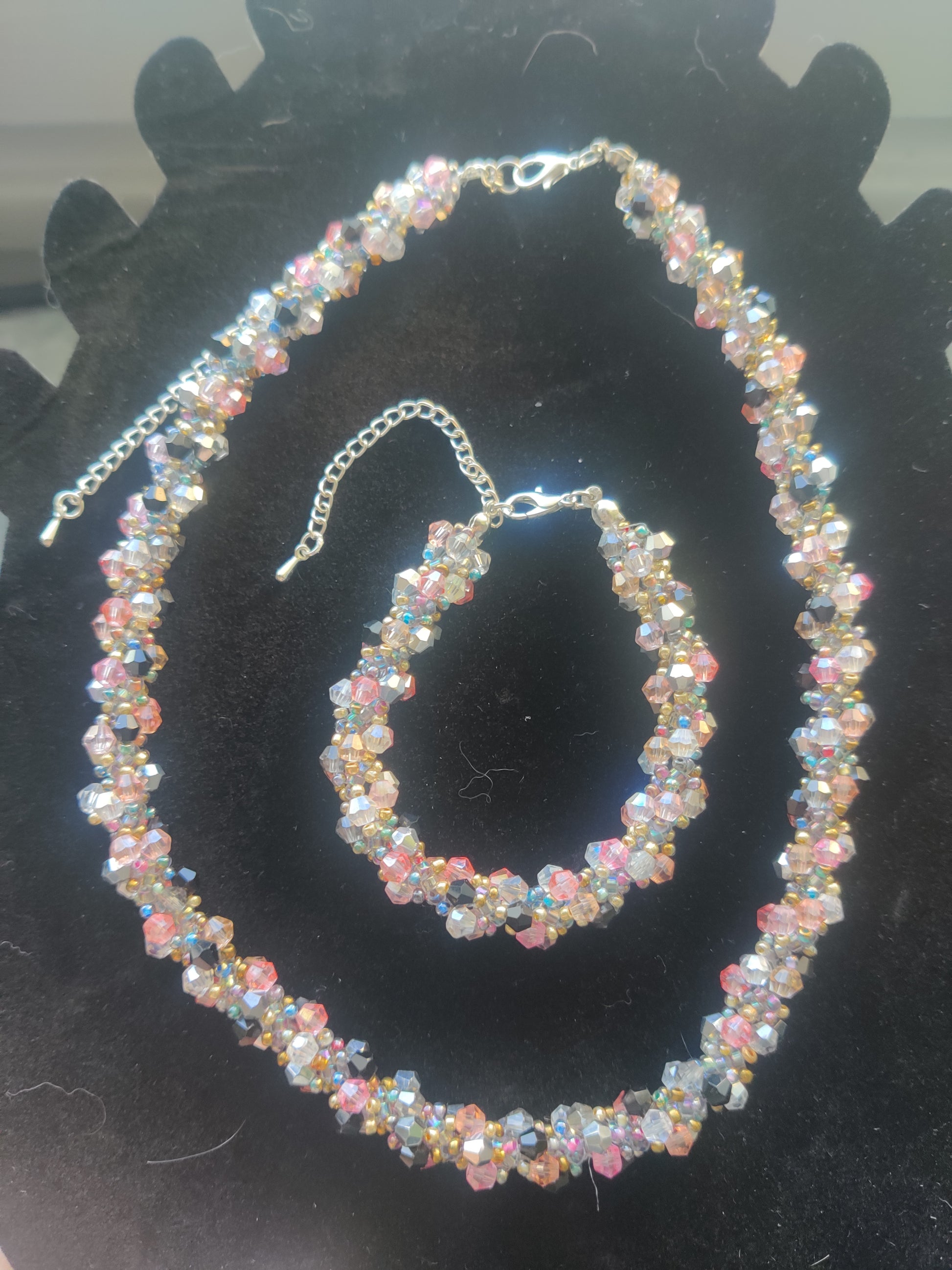 Ett elegant matchande smyckesset bestående av halsband och armband, handgjort med facetterade glaspärlor i en vacker blandning av svart, rosa, vita och iriserade toner.