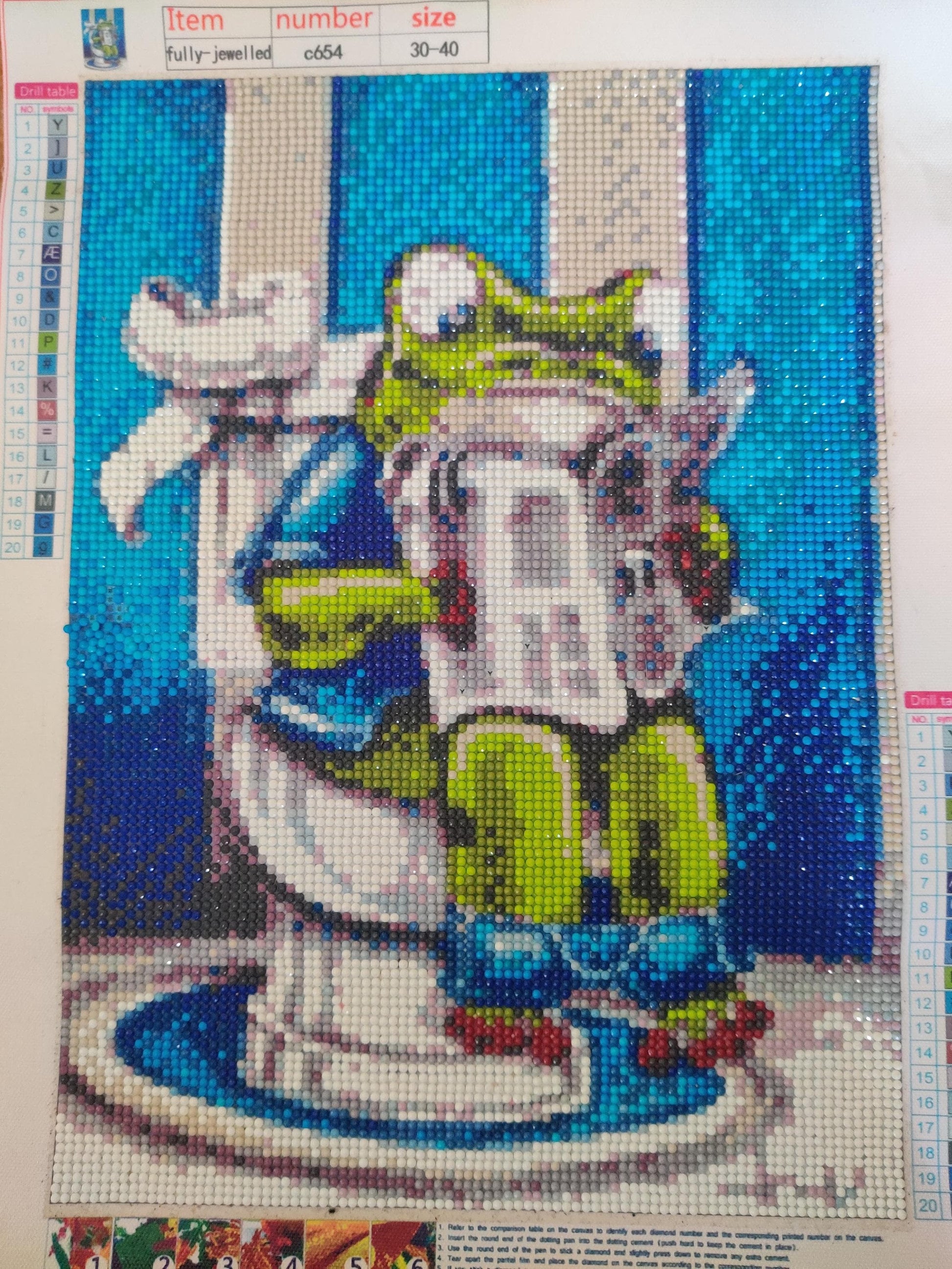 Rolig diamond painting med motiv av en groda som läser tidning på toaletten.