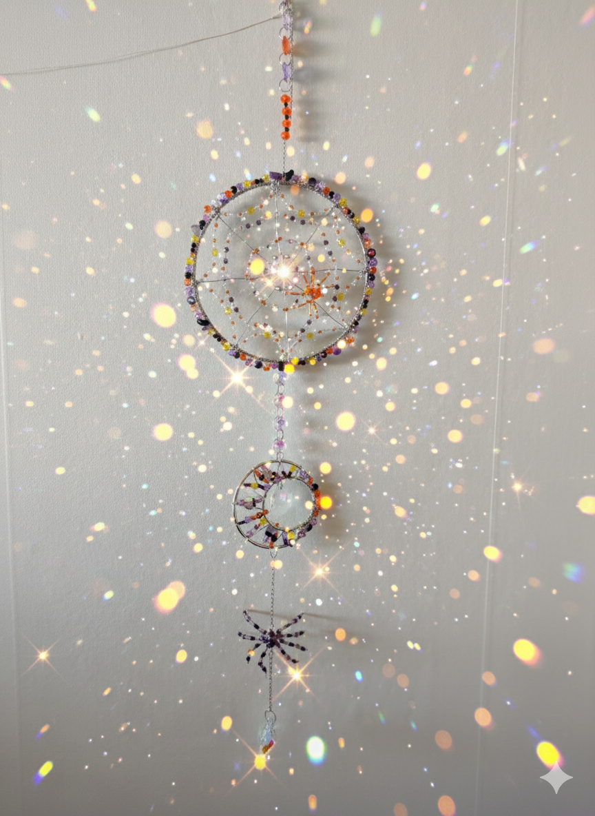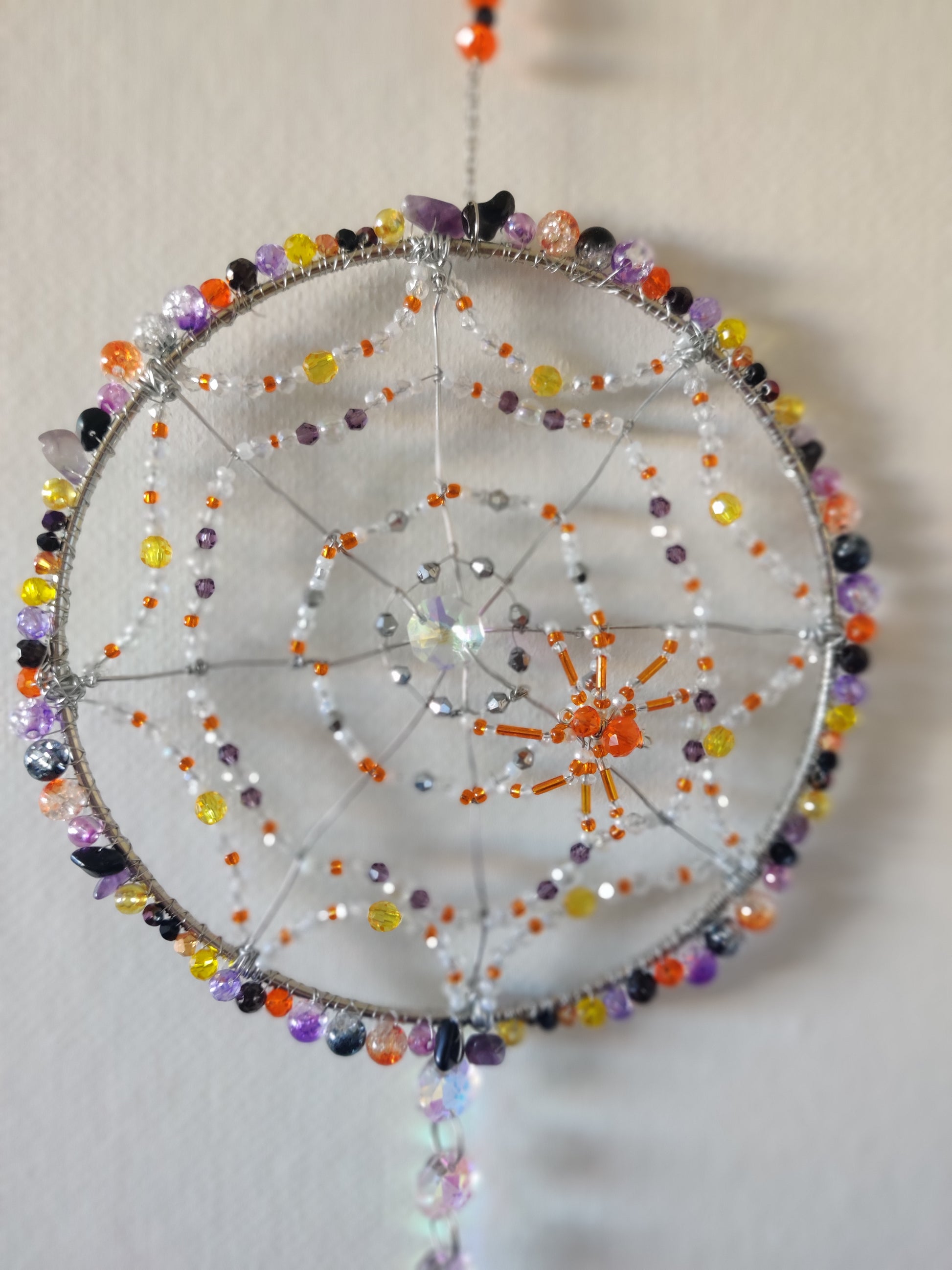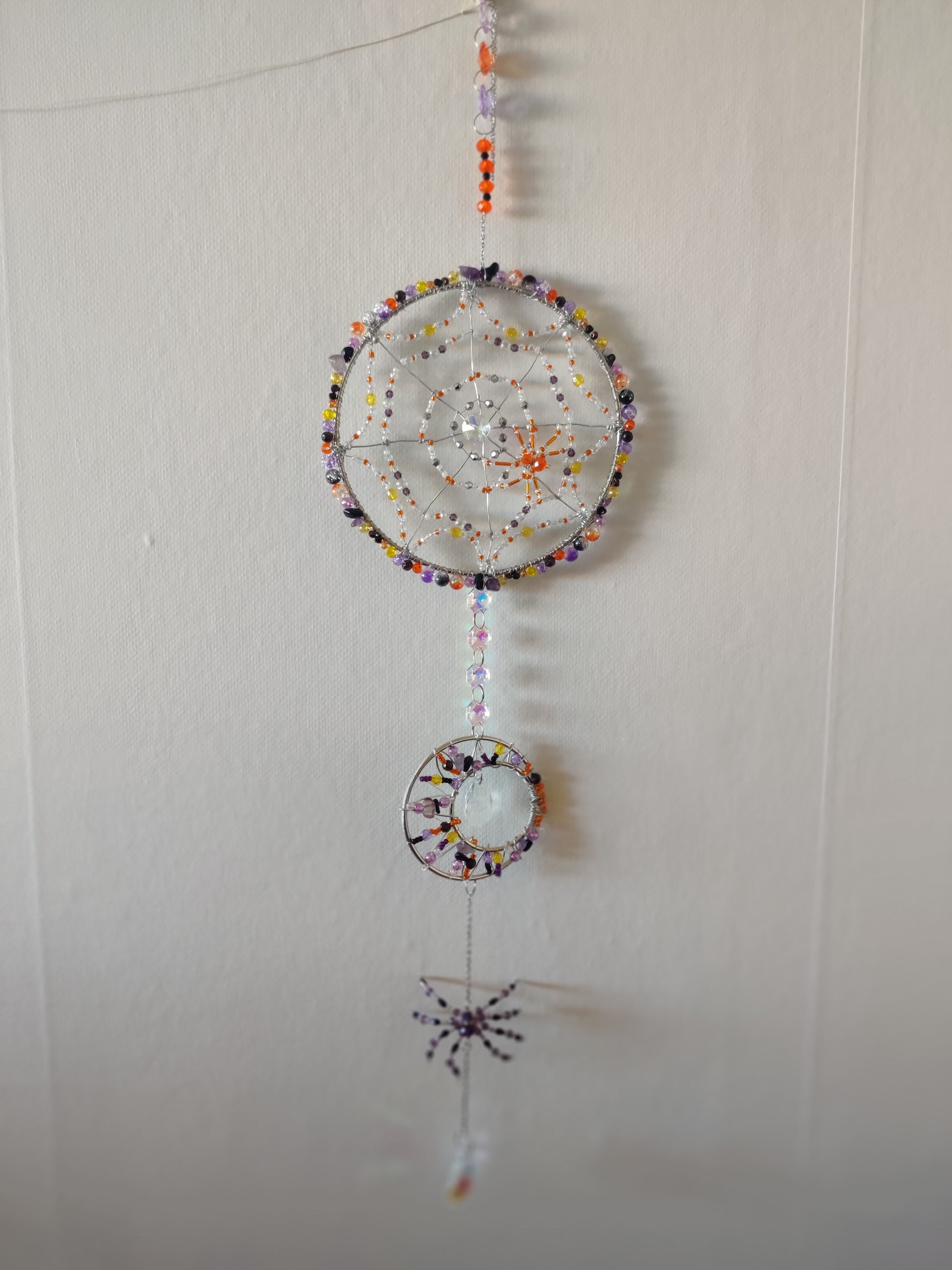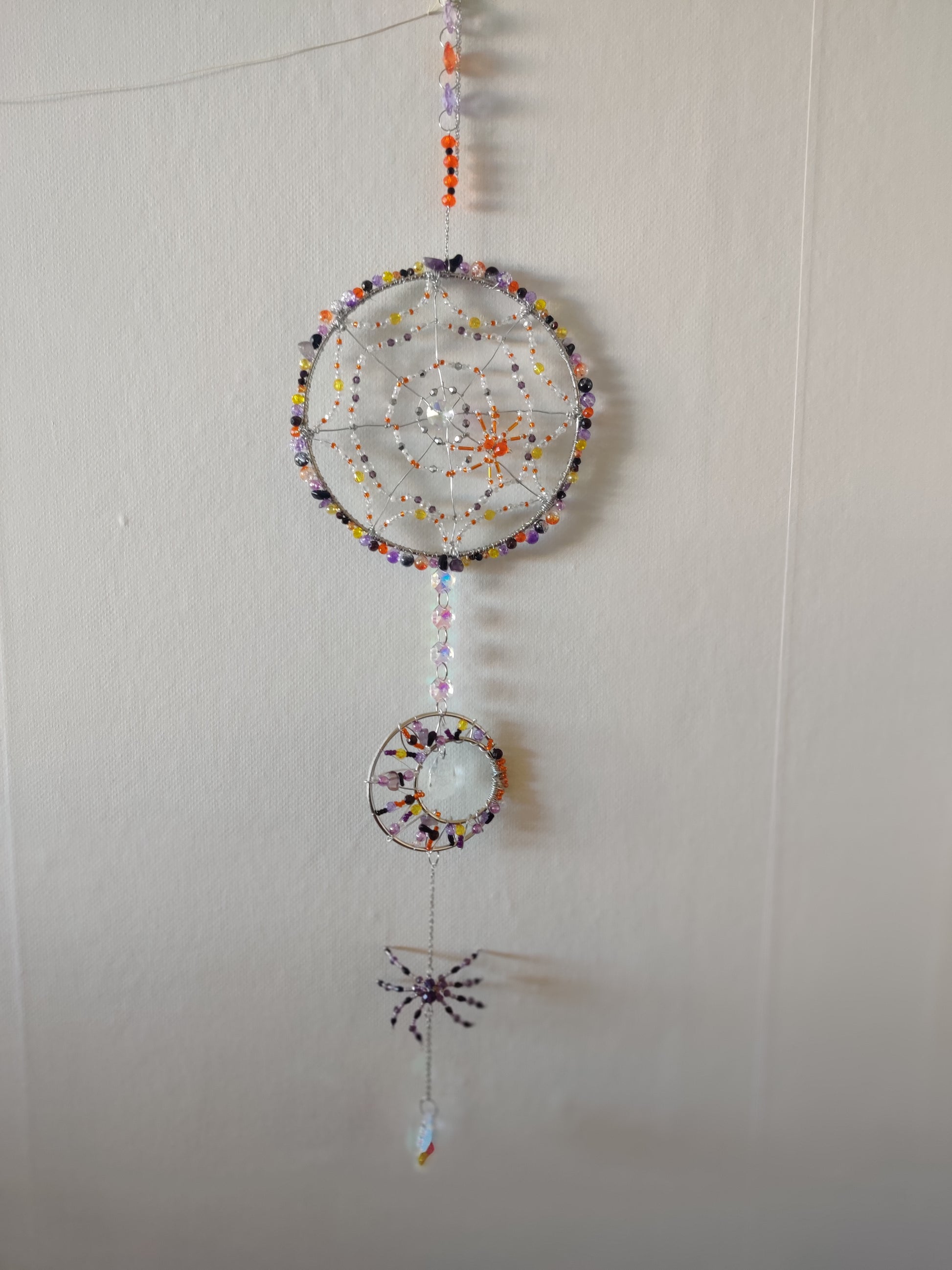 En mystisk och vacker handgjord drömfångare perfekt för Halloween! Denna unika dekoration kombinerar traditionell drömfångare-design med spöklika spindlar och intrikata spindelnätsmönster.