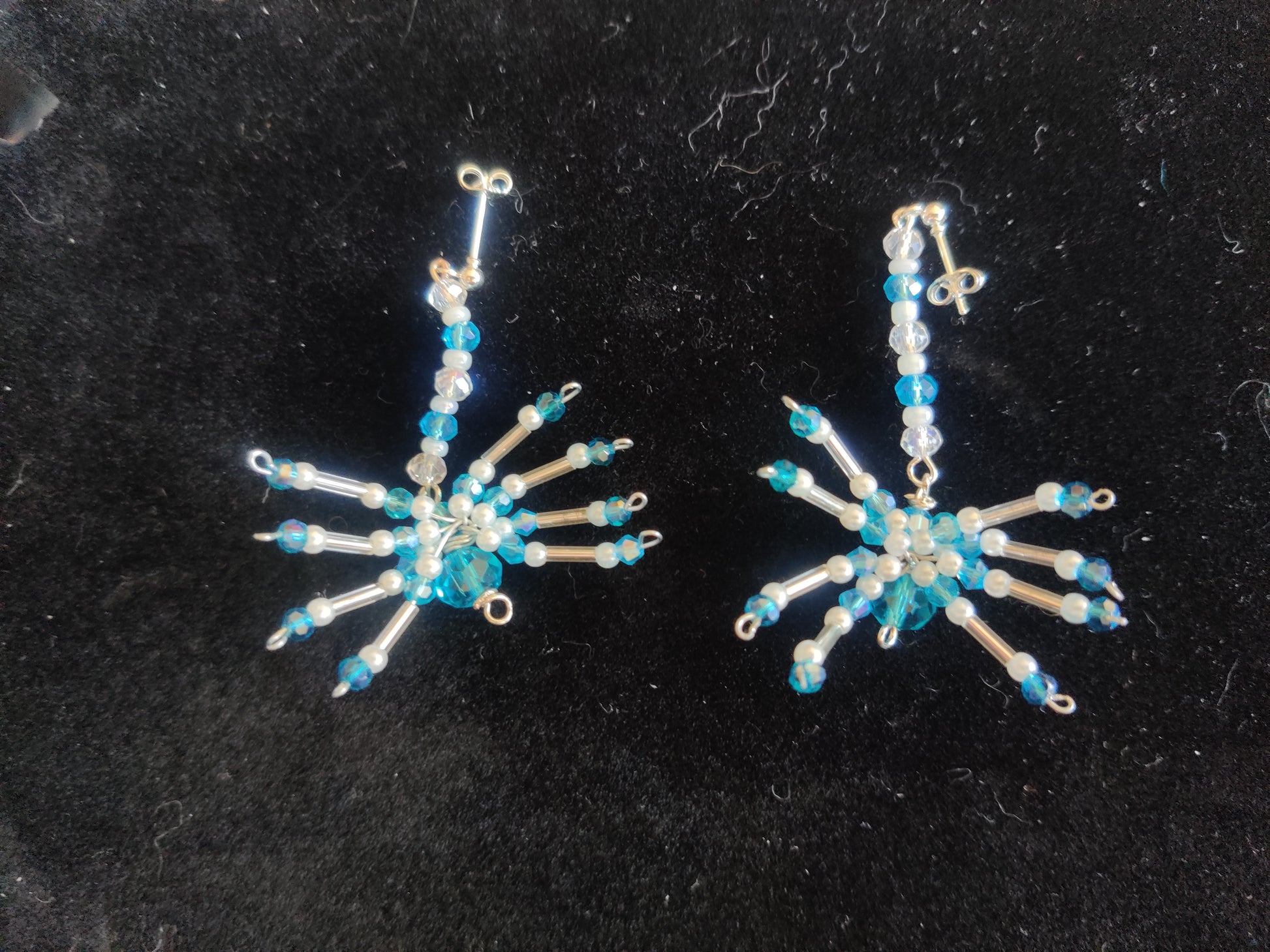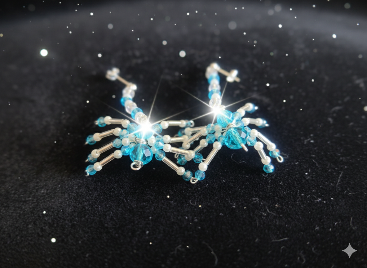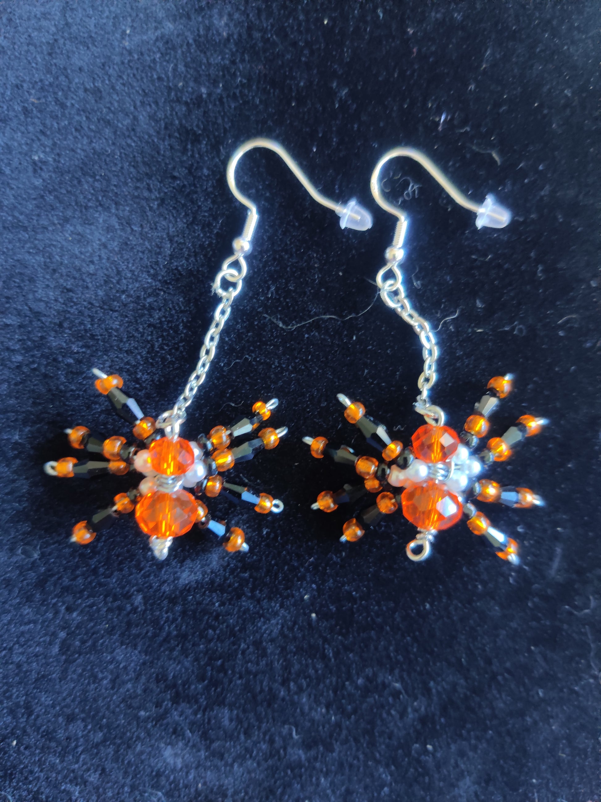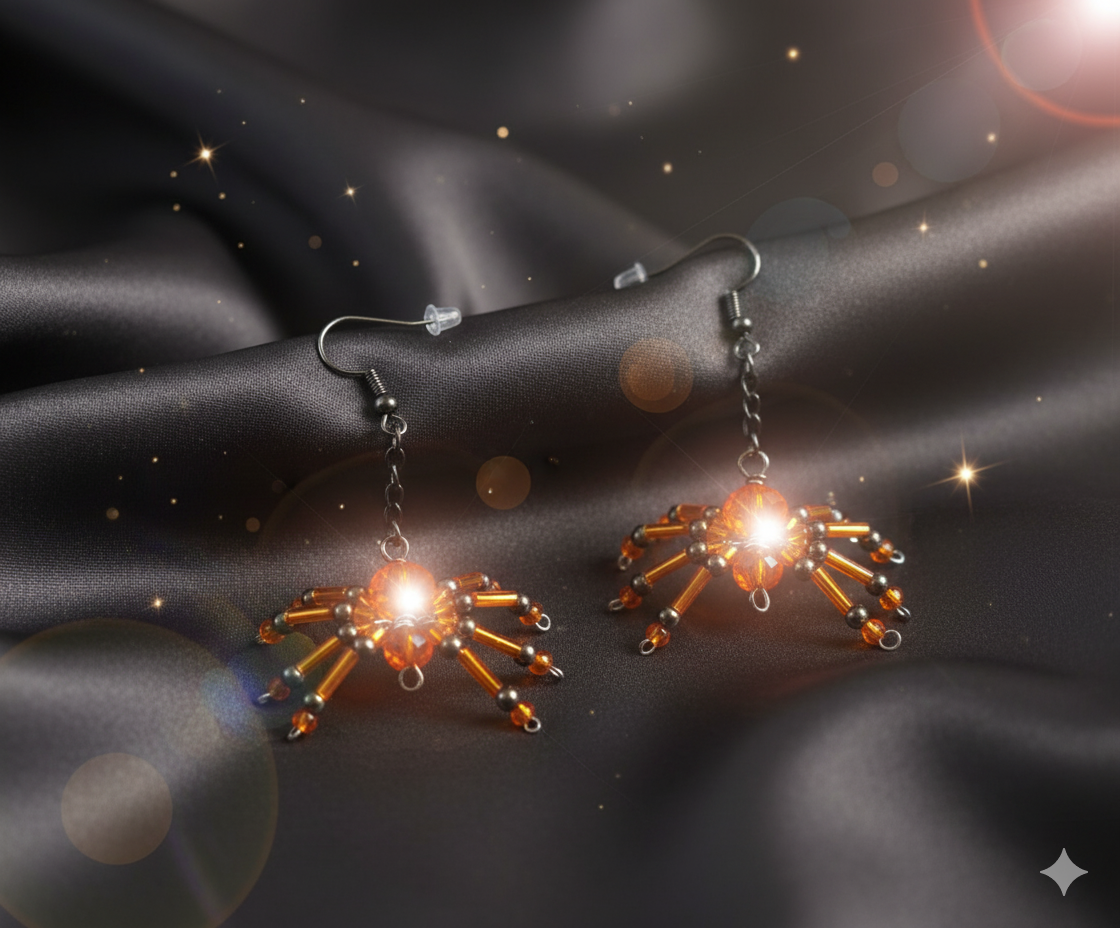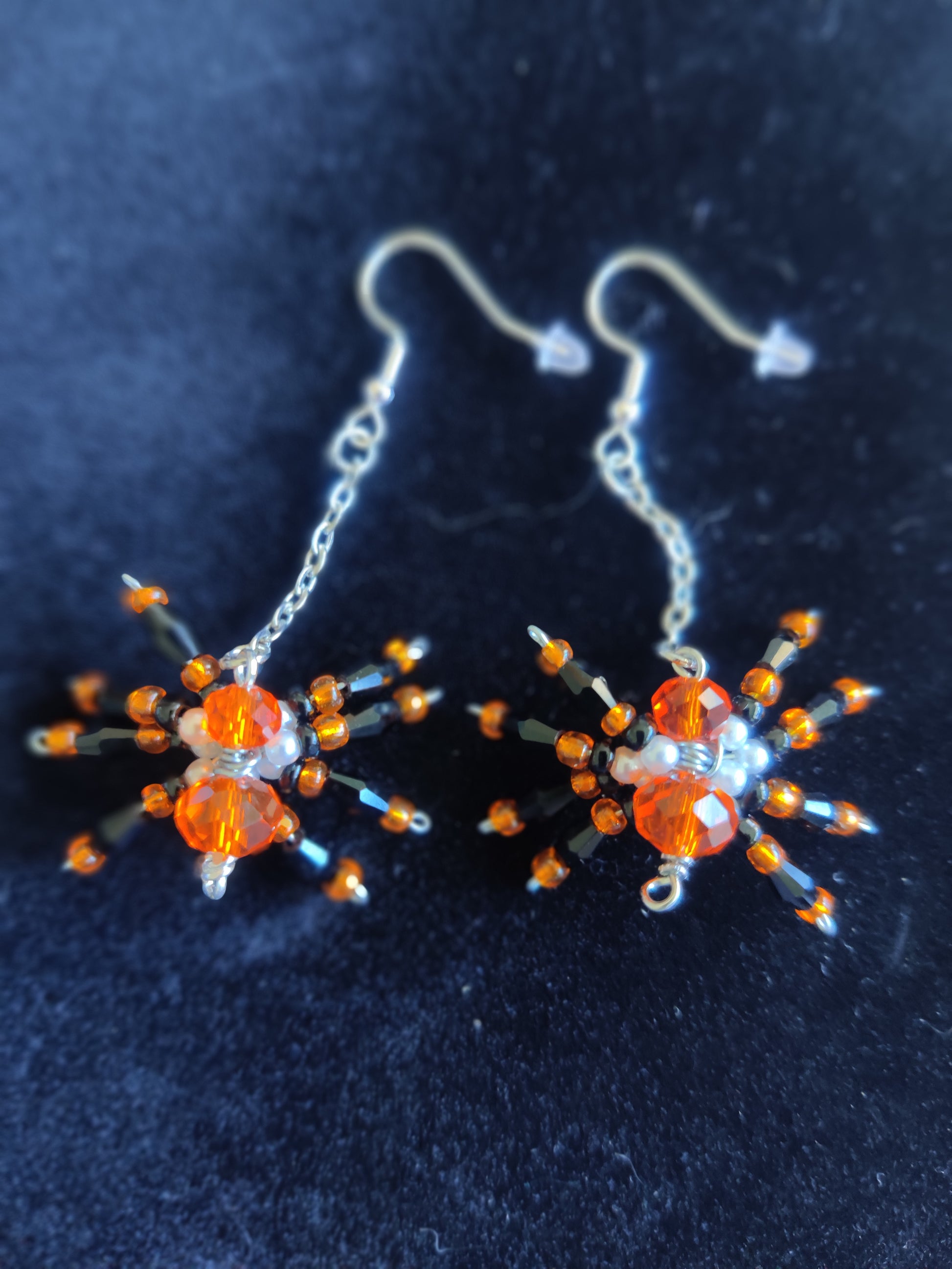 Fantastiska handgjorda spindelörhängen perfekta för Halloween! Dessa unika örhängen är tillverkade med detaljerade spindlar i orange och blå kristaller som fångar ljuset vackert.