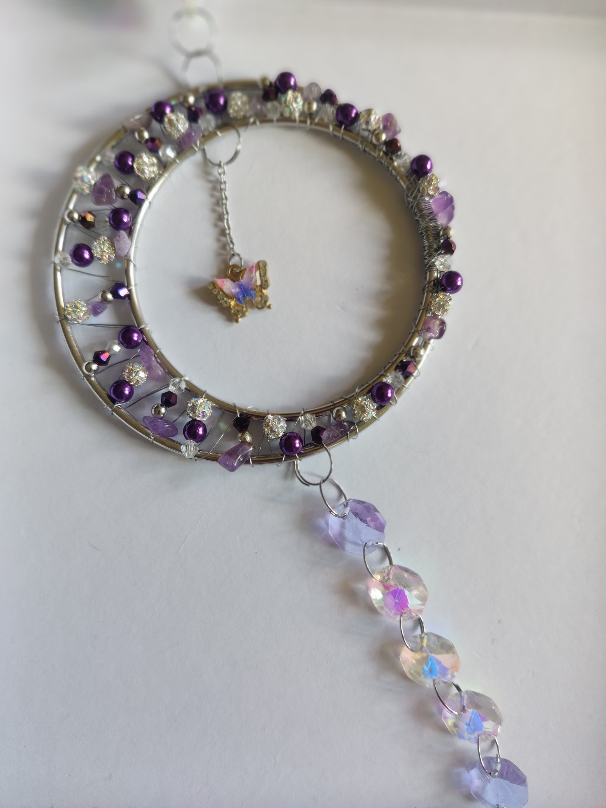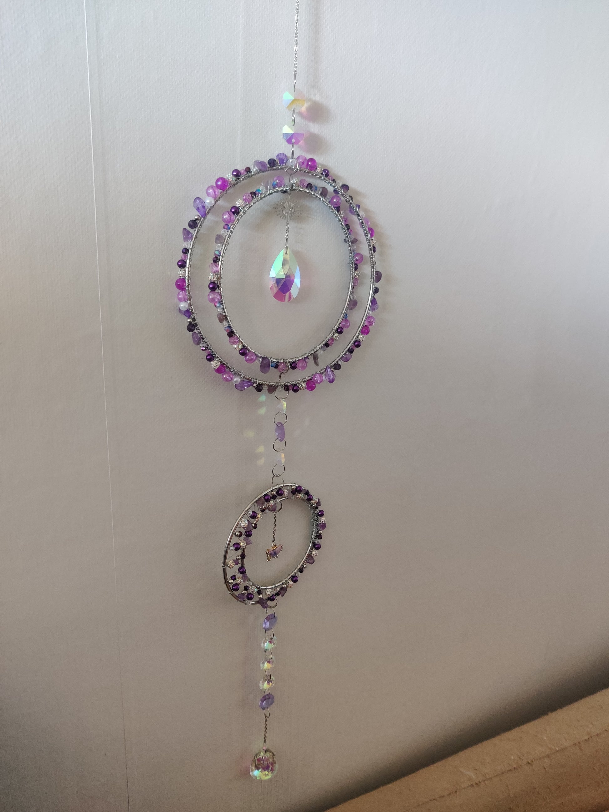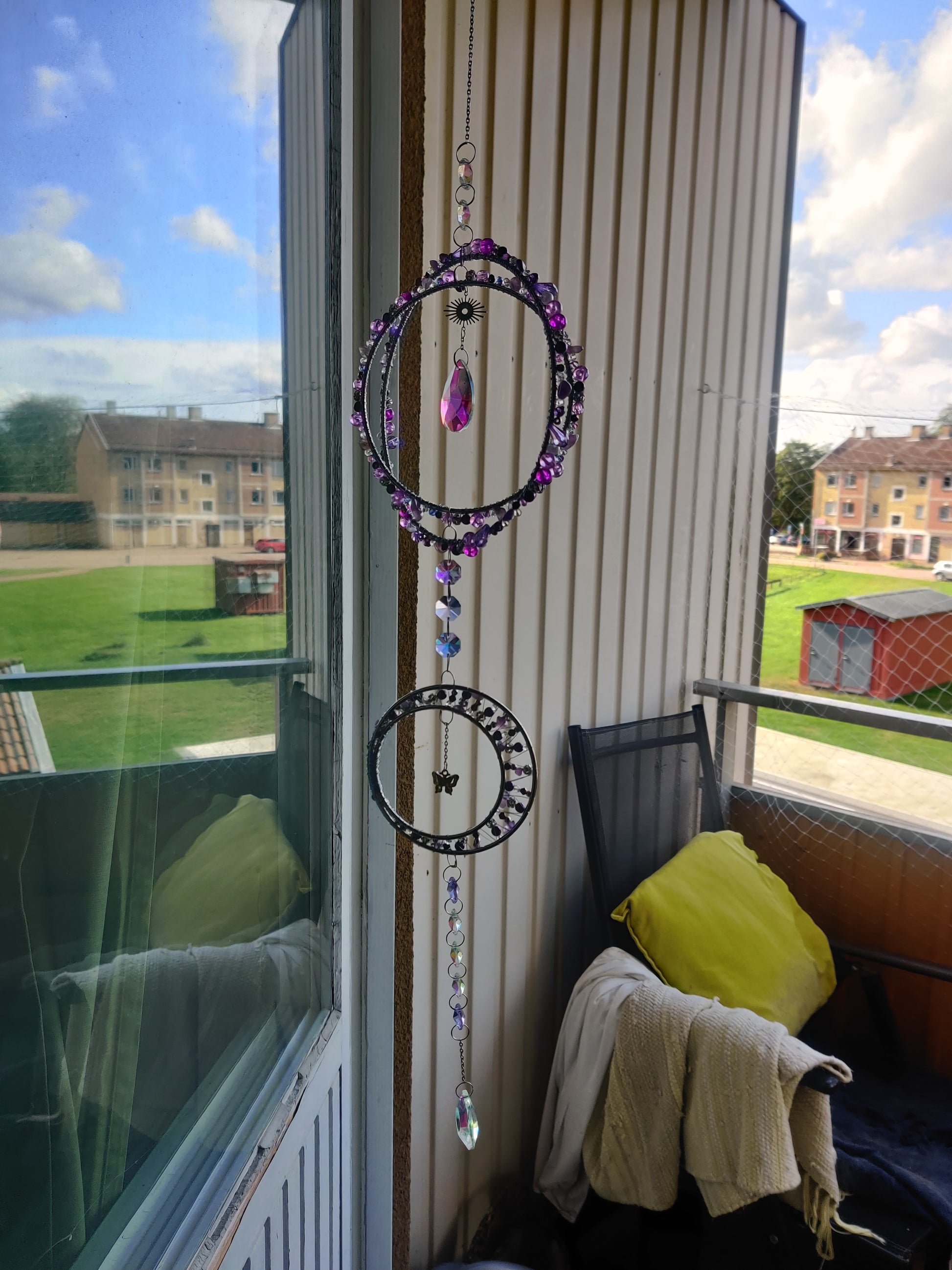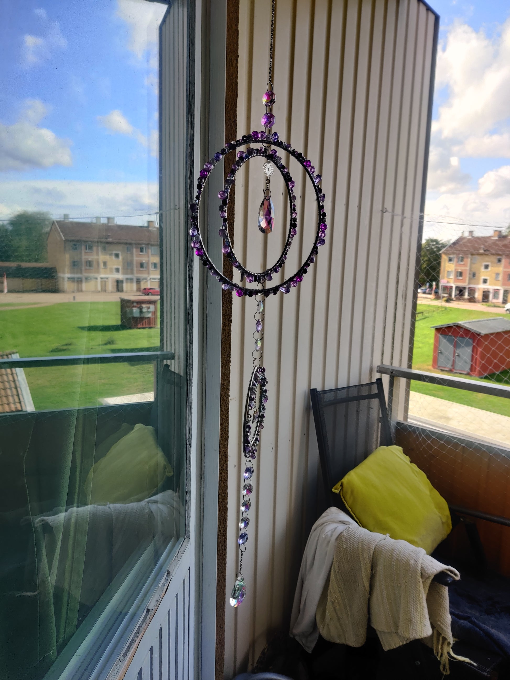 En vacker handgjord kristallprydnad som skapar magiska ljusreflexer i ditt fönster. Denna unika dekoration är tillverkad med lila kristaller och dekorativa pärlor som fångar och bryter ljuset på ett förtrollande sätt.