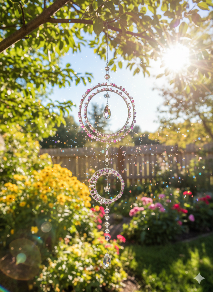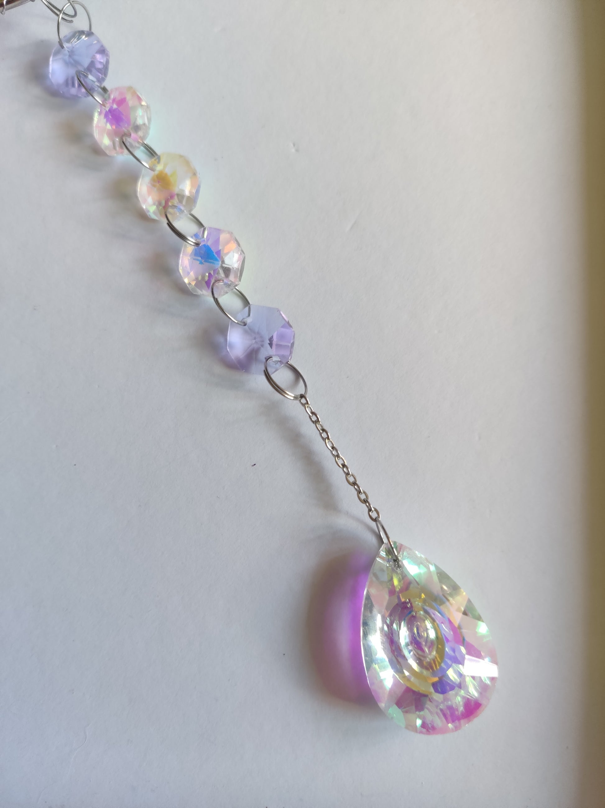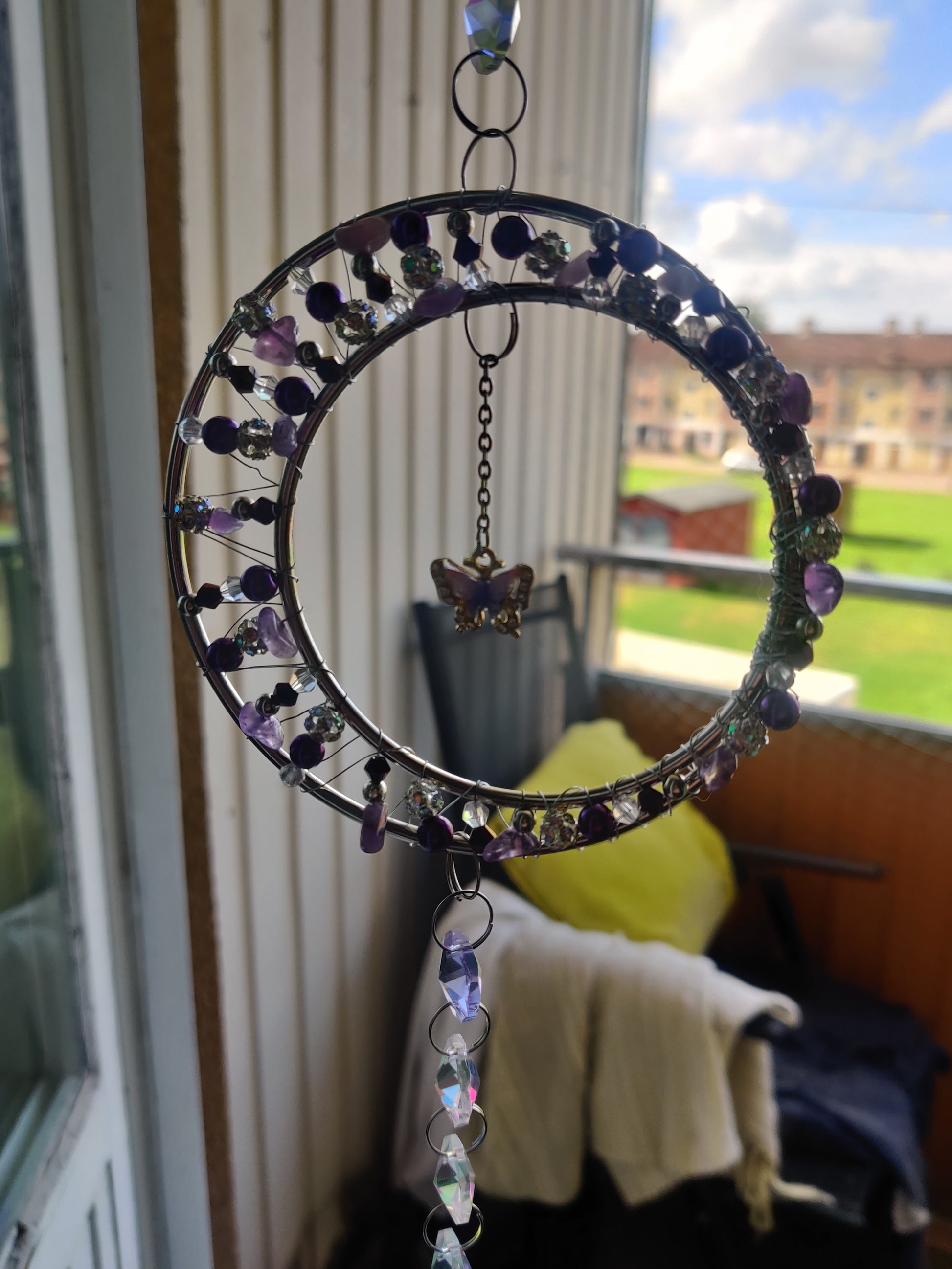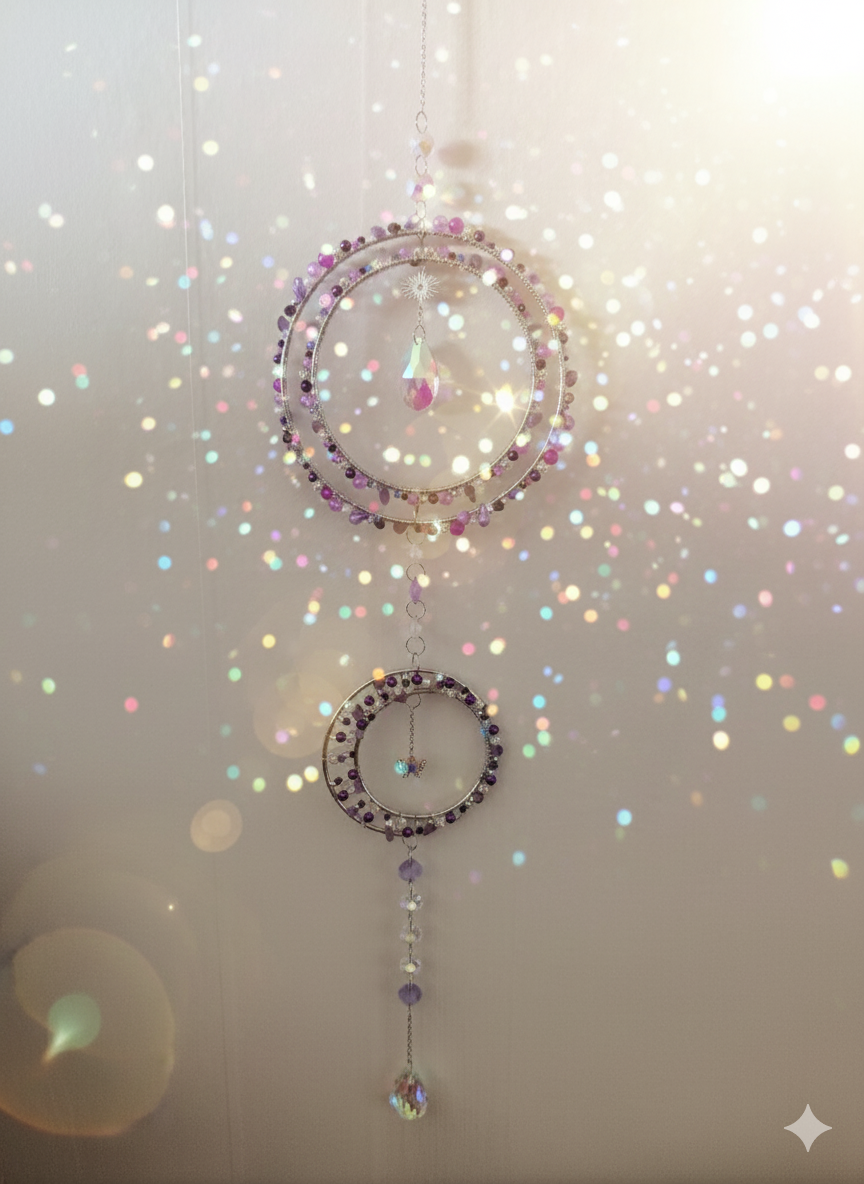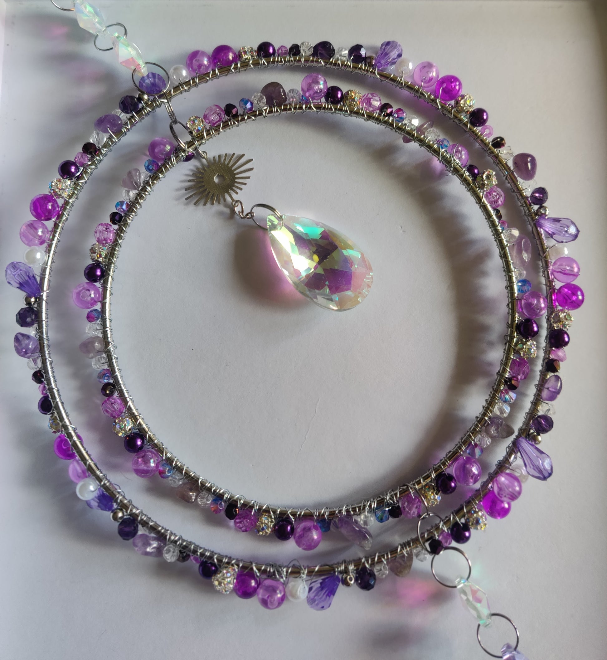 En vacker handgjord kristallprydnad som skapar magiska ljusreflexer i ditt fönster. Denna unika dekoration är tillverkad med lila kristaller och dekorativa pärlor som fångar och bryter ljuset på ett förtrollande sätt.