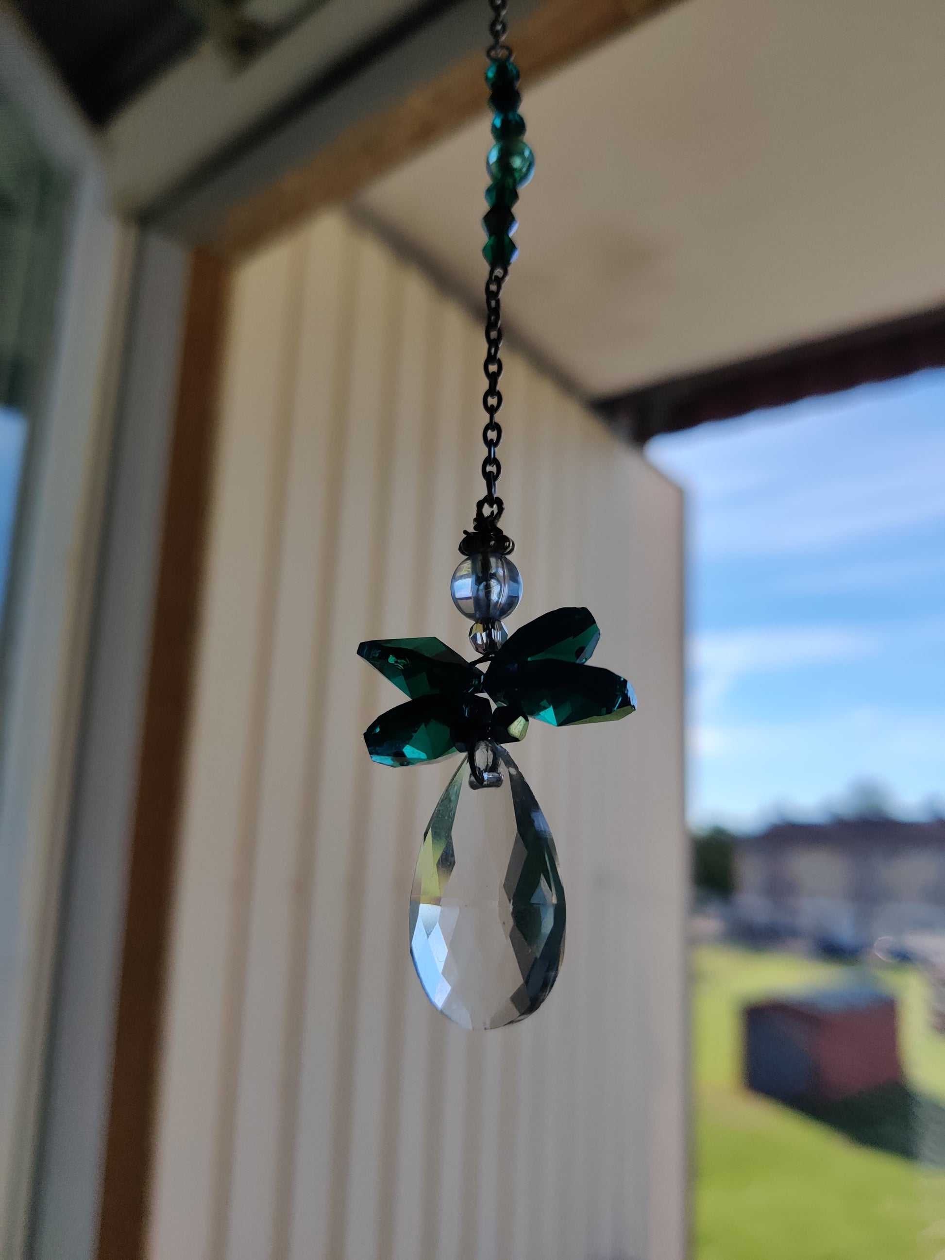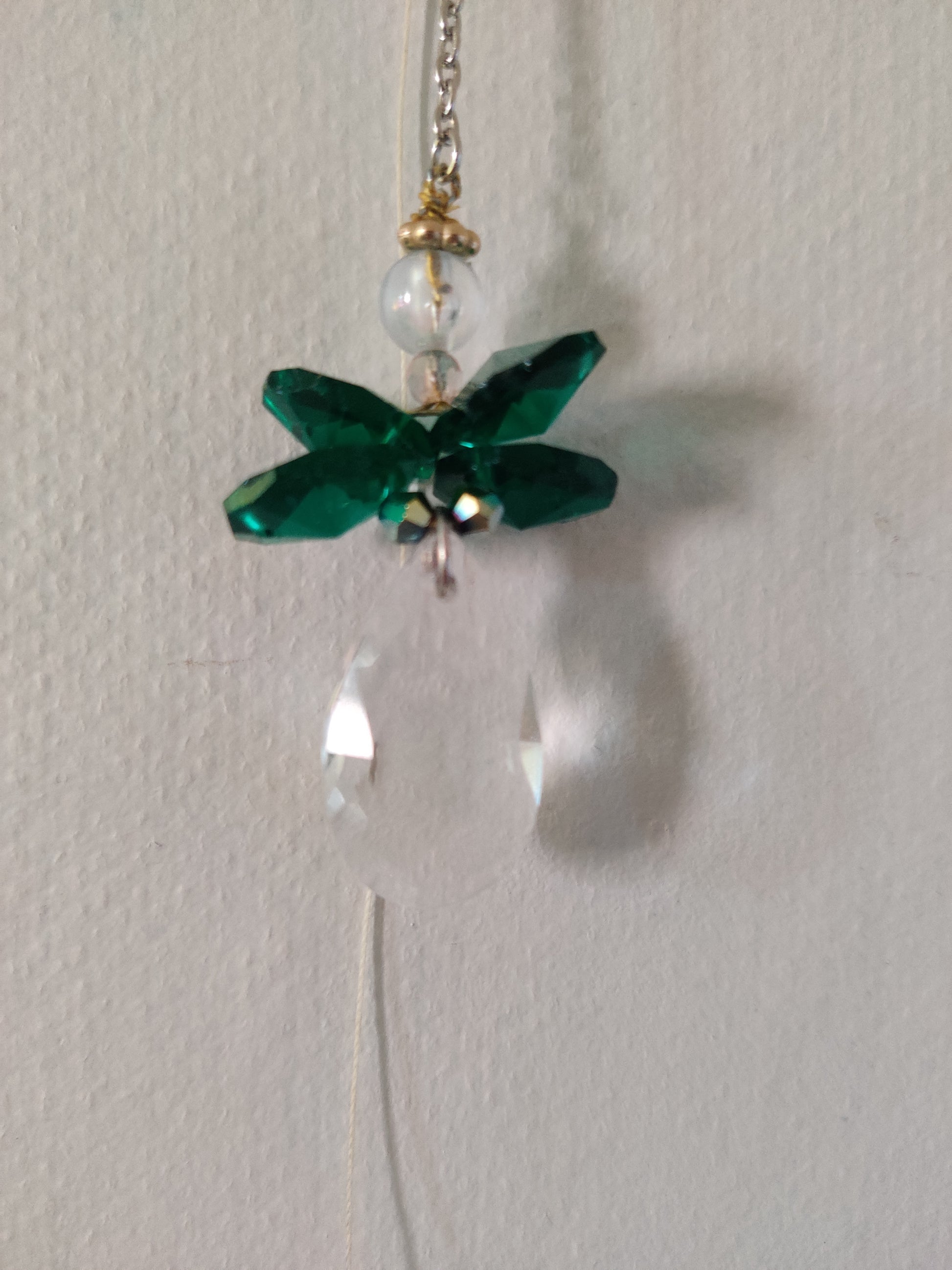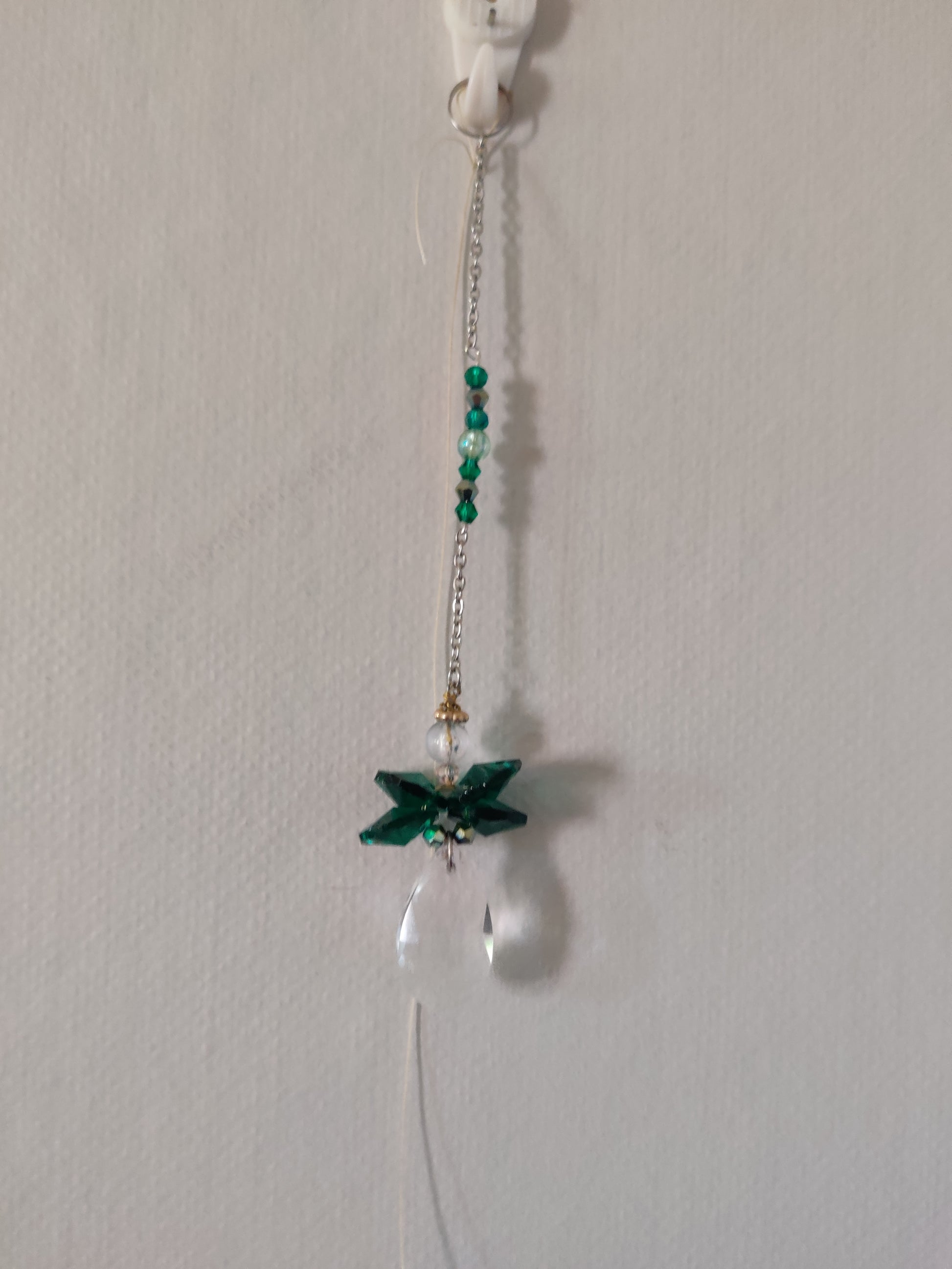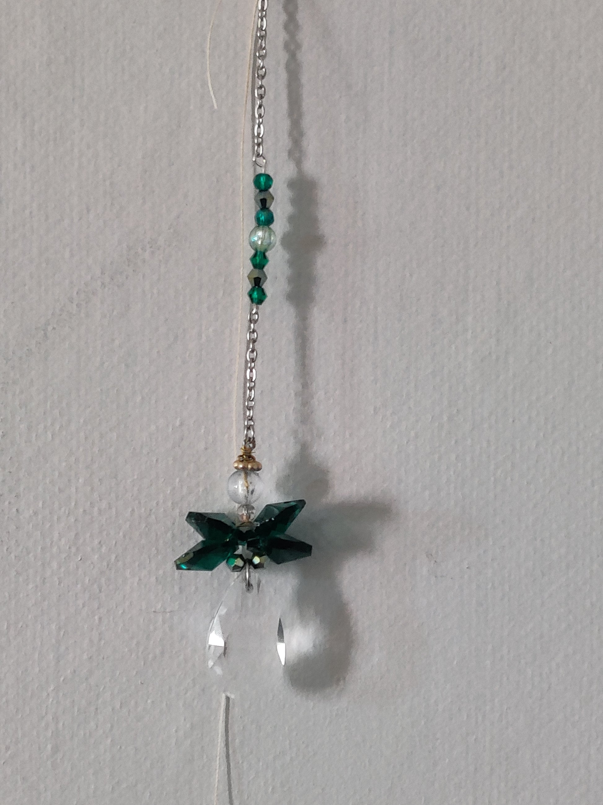 En vacker handgjord skyddsängel med gröna kristaller och klara droppar. Denna eleganta ängel är noggrant tillverkad med silverkedja och dekorativa pärlor i gröna nyanser.