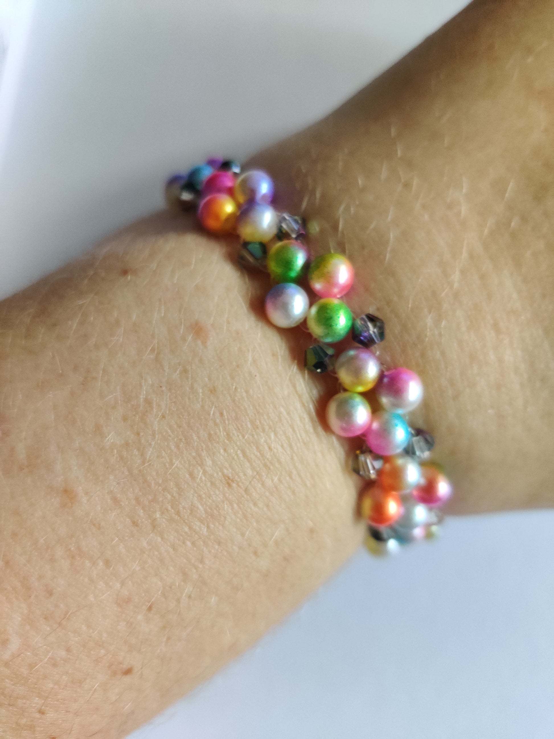 Ett vackert handgjort armband med färgglada glaspärlor i regnbågens alla färger. Detta unika armband kombinerar glansiga pärlor i olika nyanser med eleganta kristallaccenter.
