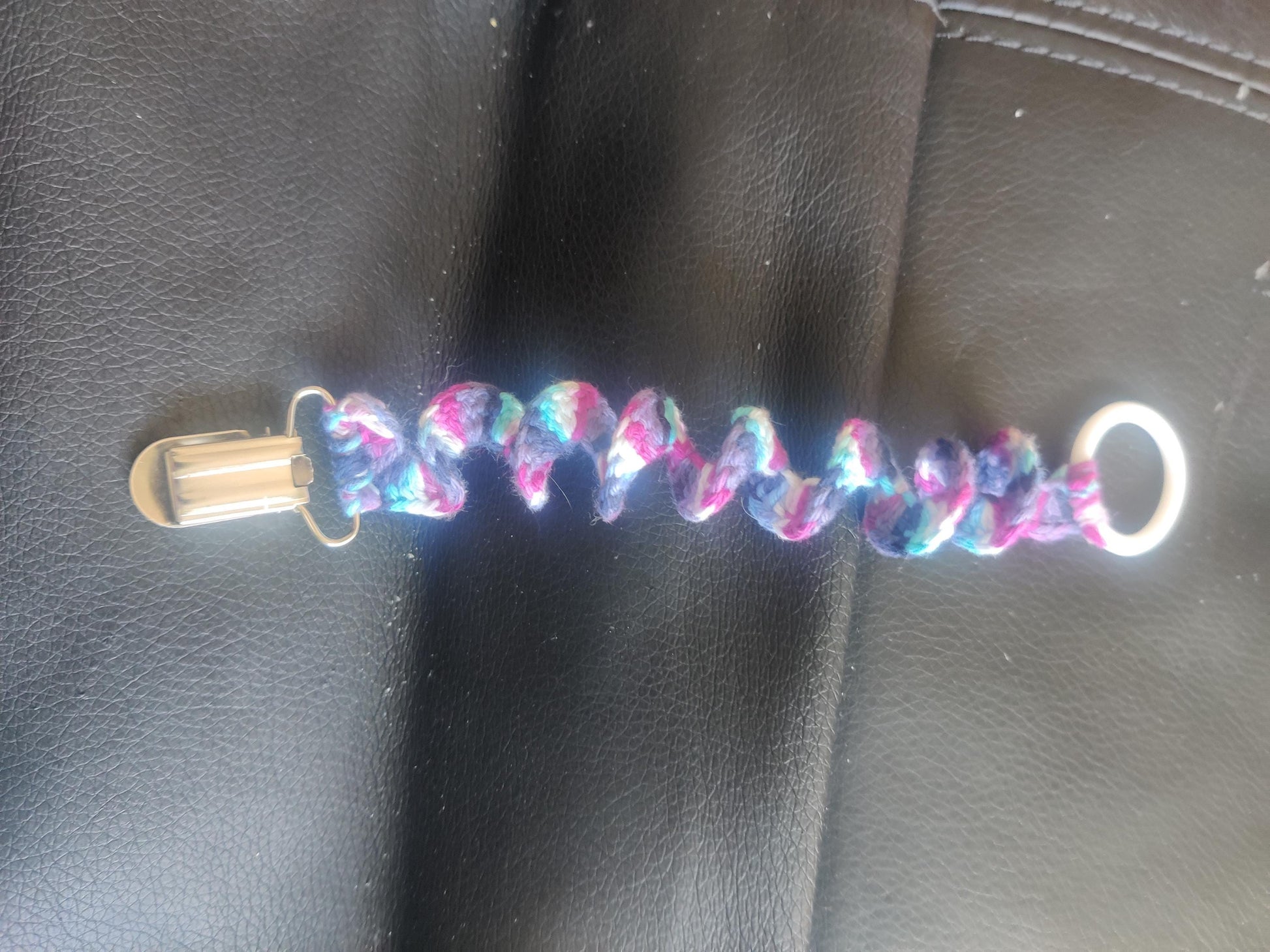 Napphållaren förhindrar att nappen faller ner och går förlorad, samtidigt som den tillför en färgglad touch till barnets outfit.