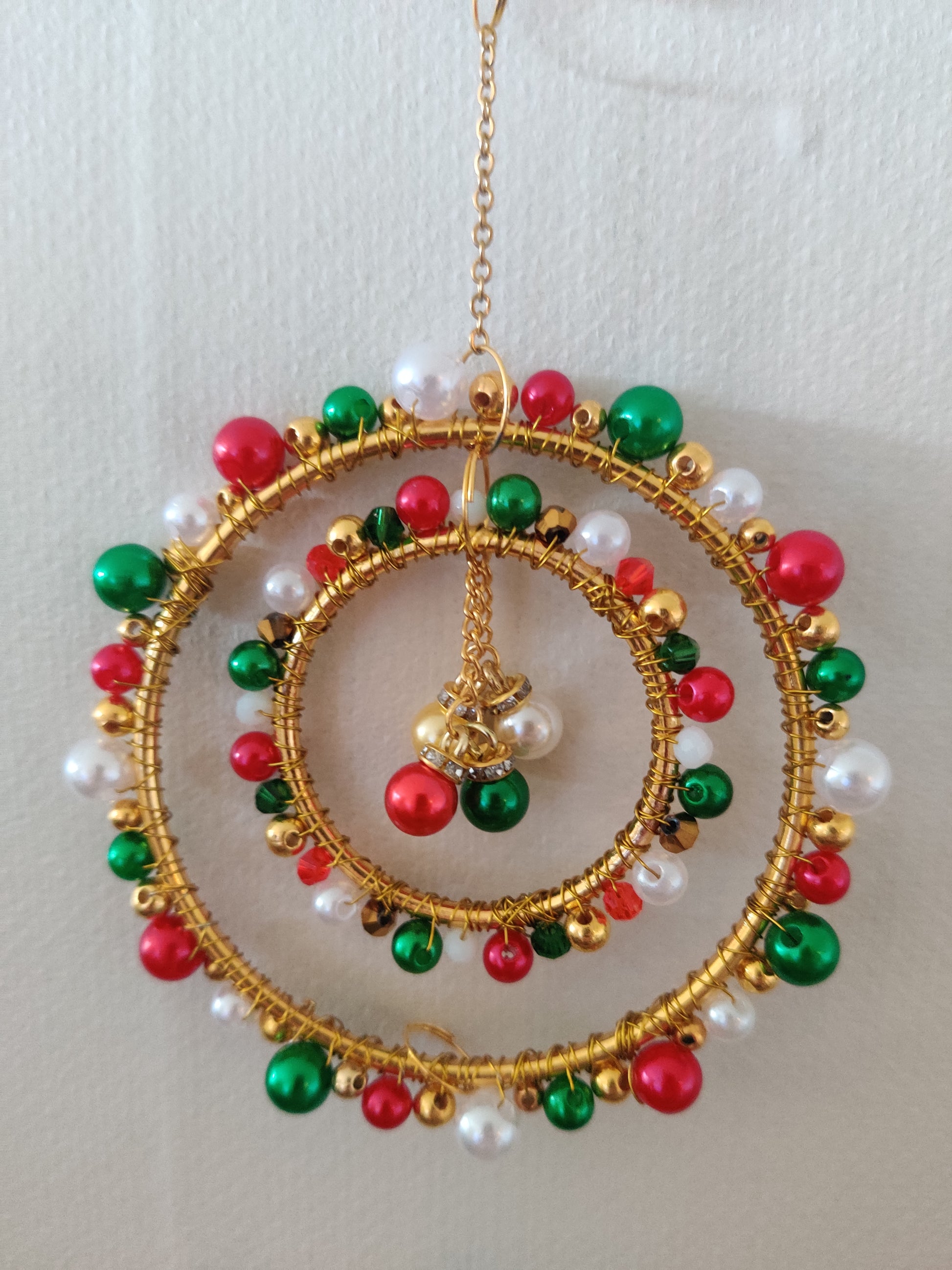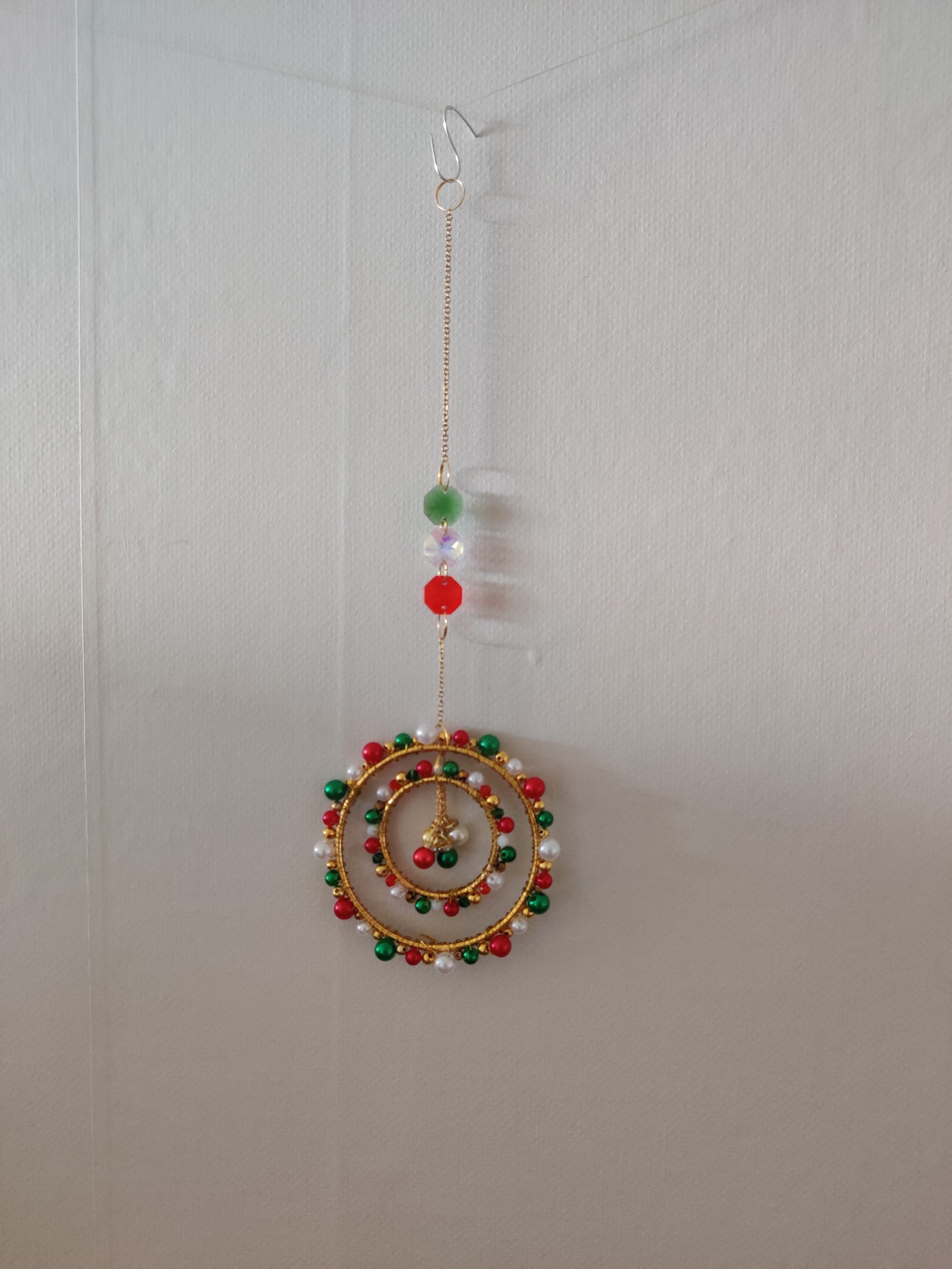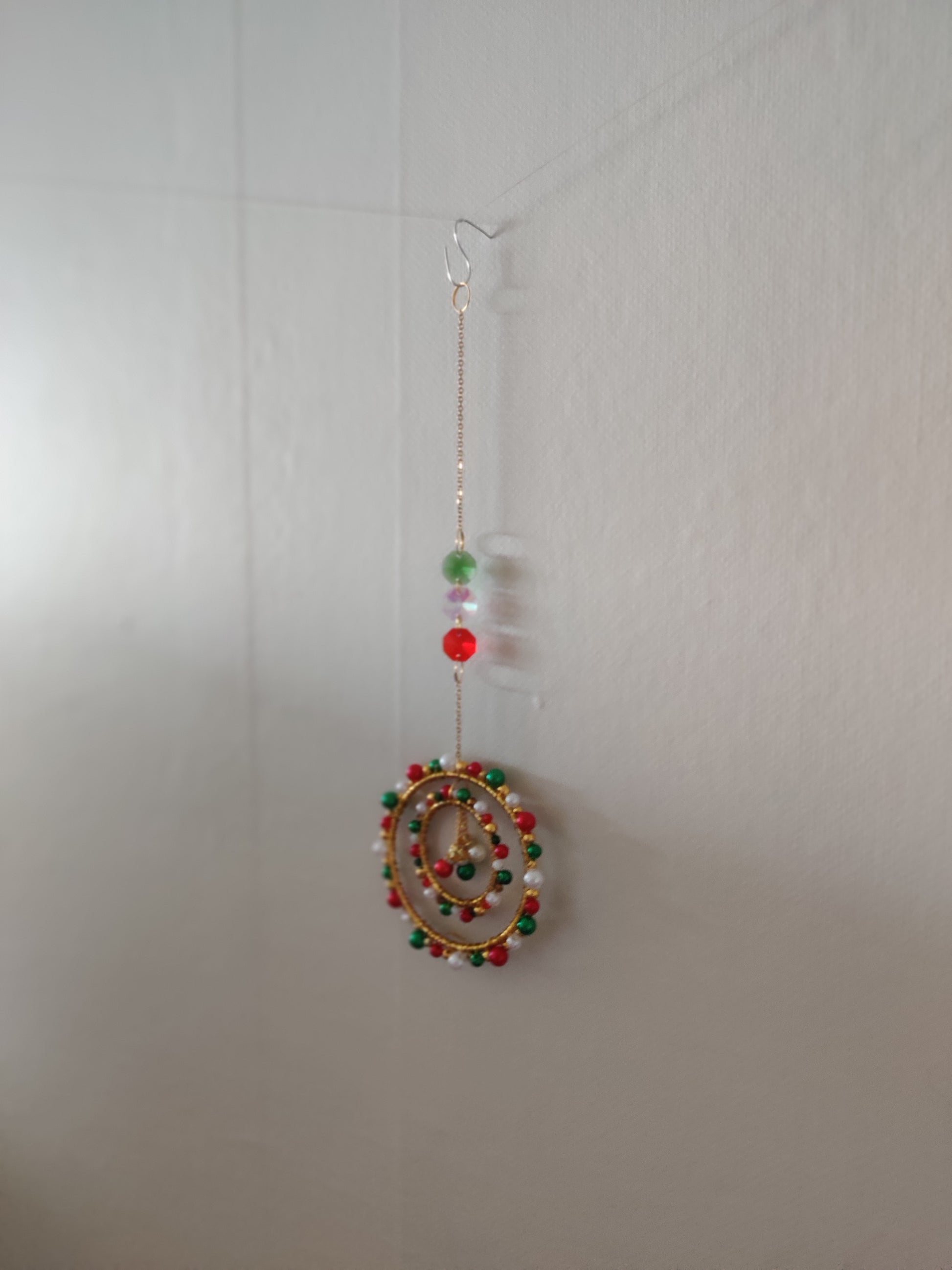 Dekorationen är utsmyckad med glittrande pärlor i klassiska julfärger - rött, grönt, vitt och guld. Den dubbla spiralen skapar en dynamisk effekt när den snurrar och ljuset träffar de färgglada pärlorna.