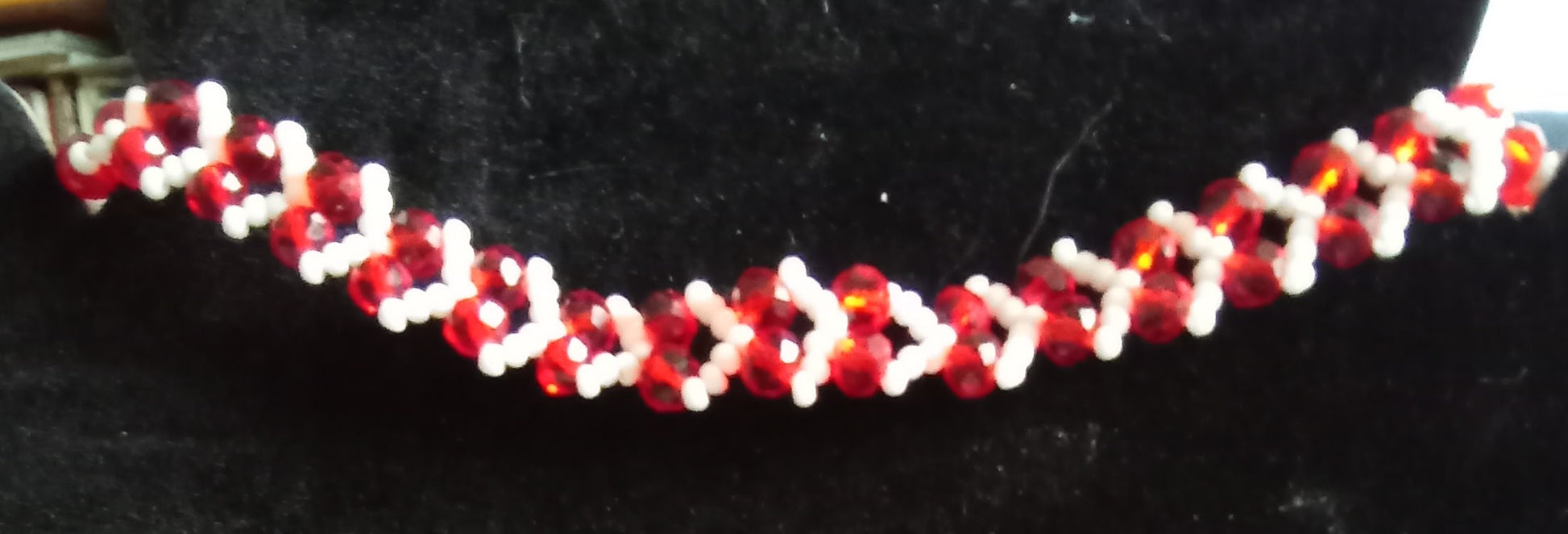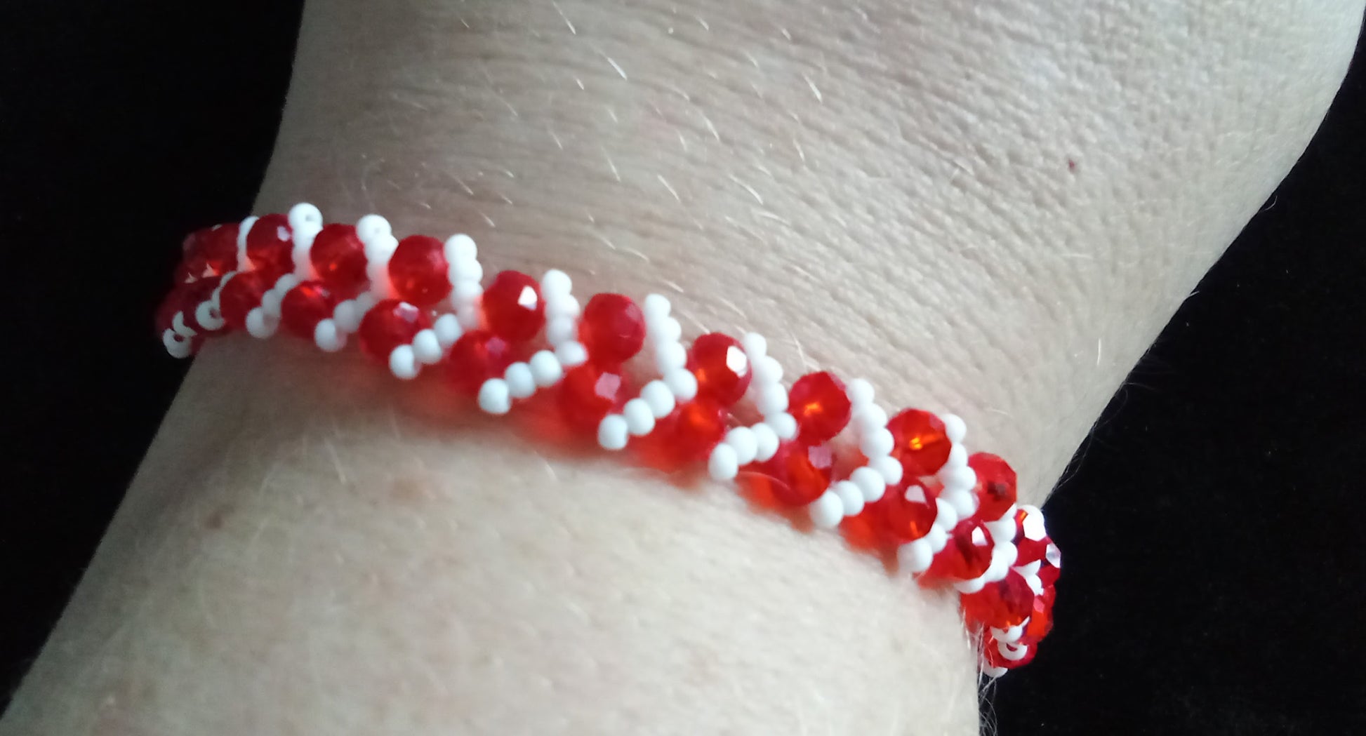 Ett handgjort armband med facetterade kristallpärlor i rött och vitt som bildar ett vackert hjärtmönster. Passar både vardag och fest.